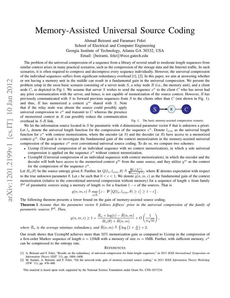 The problem of the universal compression of a sequence from a library of several small to moderate length sequences from similar context arises in many practical scenarios, such as the compression of the storage data and the Internet traffic. In such scenarios, it is often required to compress and decompress every sequence individually. However, the universal compression of the individual sequences suffers from significant redundancy overhead. In this paper, we aim at answering whether or not having a memory unit in the middle can result in a fundamental gain in the universal compression. We present the problem setup in the most basic scenario consisting of a server node $S$, a relay node $R$ (i.e., the memory unit), and a client node $C$. We assume that server $S$ wishes to send the sequence $x^n$ to the client $C$ who has never had any prior communication with the server, and hence, is not capable of memorization of the source context. However, $R$ has previously communicated with $S$ to forward previous sequences from $S$ to the clients other than $C$, and thus, $R$ has memorized a context $y^m$ shared with $S$. Note that if the relay node was absent the source could possibly apply universal compression to $x^n$ and transmit to $C$ whereas the presence of memorized context at $R$ can possibly reduce the communication overhead in $S$-$R$ link. In this paper, we investigate the fundamental gain of the context memorization in the memory-assisted universal compression of the sequence $x^n$ over conventional universal source coding by providing a lower bound on the gain of memory-assisted source coding.