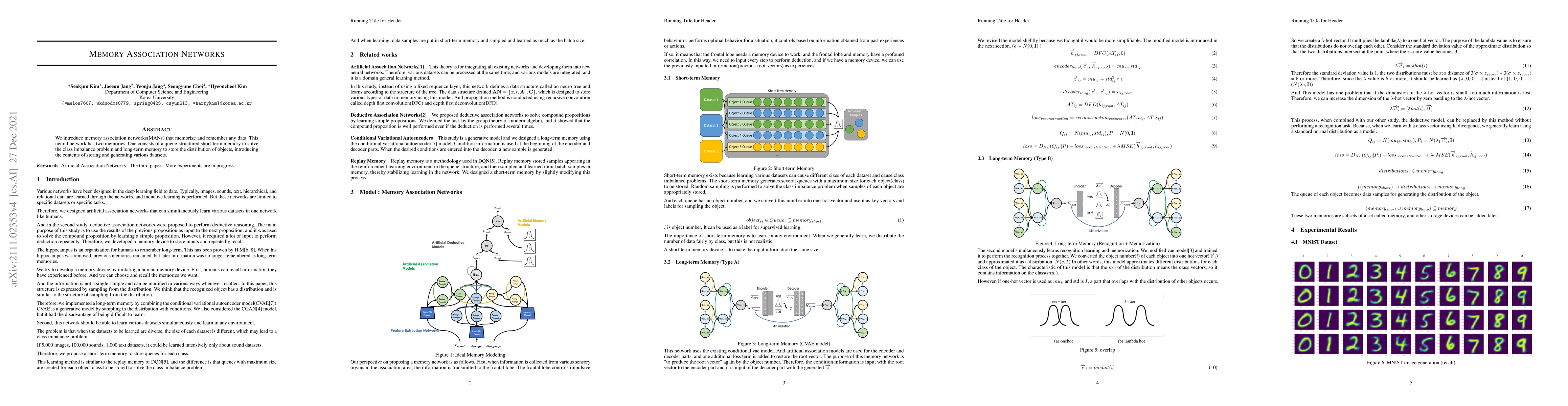 We introduce memory association networks(MANs) that memorize and remember any data. This neural network has two memories. One consists of a queue-structured short-term memory to solve the class imbalance problem and long-term memory to store the distribution of objects, introducing the contents of storing and generating various datasets.