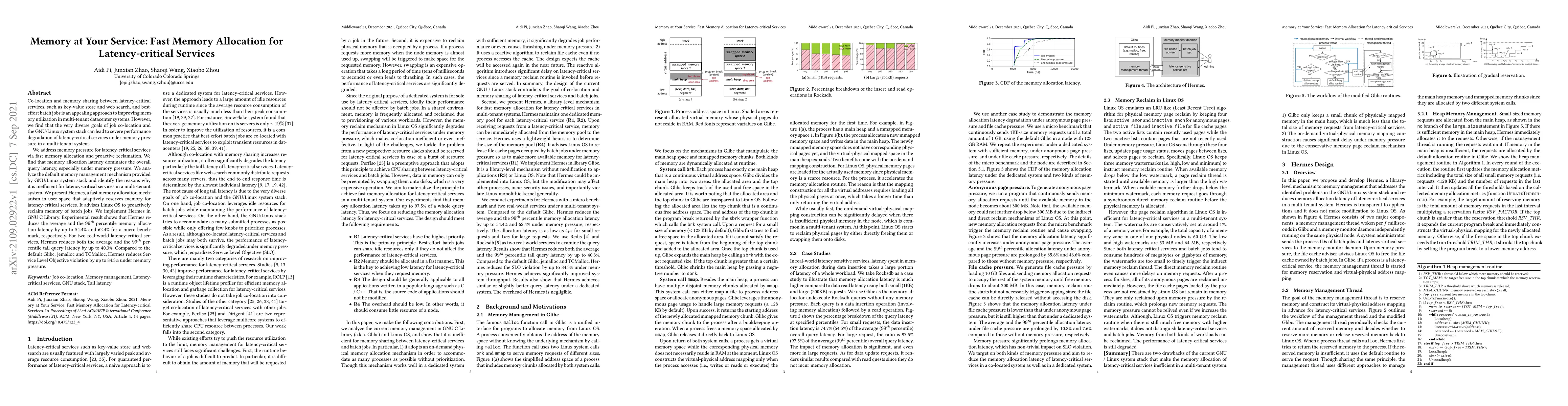 This paper proposes Hermes, a fast memory allocation mechanism for latency-critical services in multi-tenant datacenter systems, addressing performance degradation due to memory pressure. Hermes reduces memory allocation latency and proactively reclaims memory from batch jobs, achieving up to 54.4% reduction in average latency and 84.3% reduction in Service Level Objective violations compared to existing solutions.