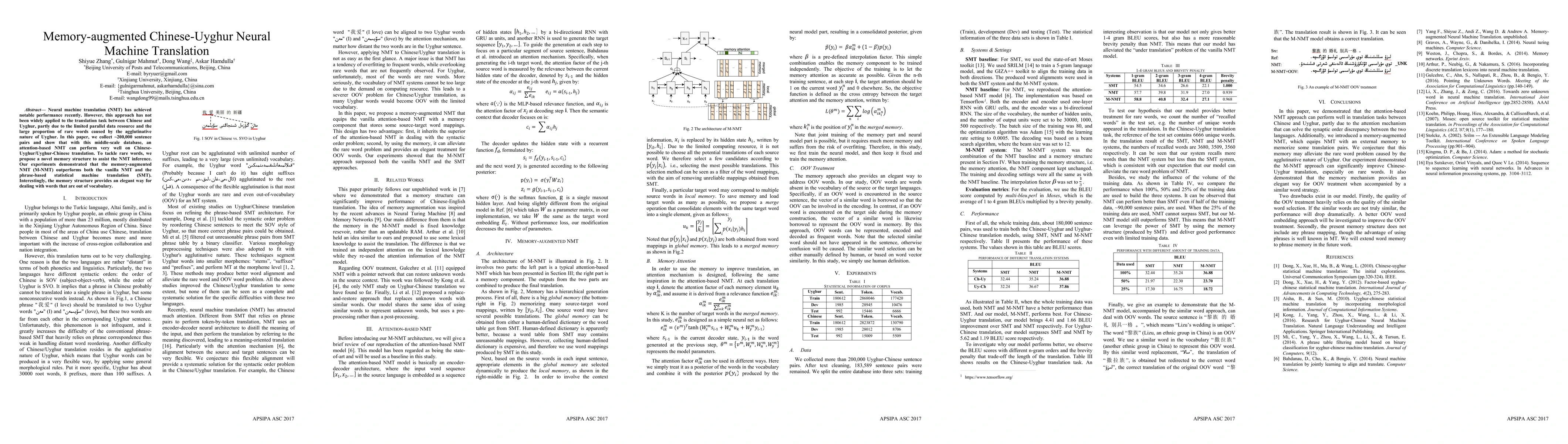 This paper presents a memory-augmented neural machine translation (M-NMT) model for Chinese-Uyghur translation, utilizing a newly collected dataset of 200,000 sentence pairs. The proposed memory structure effectively handles rare words and outperforms traditional NMT and SMT methods.
