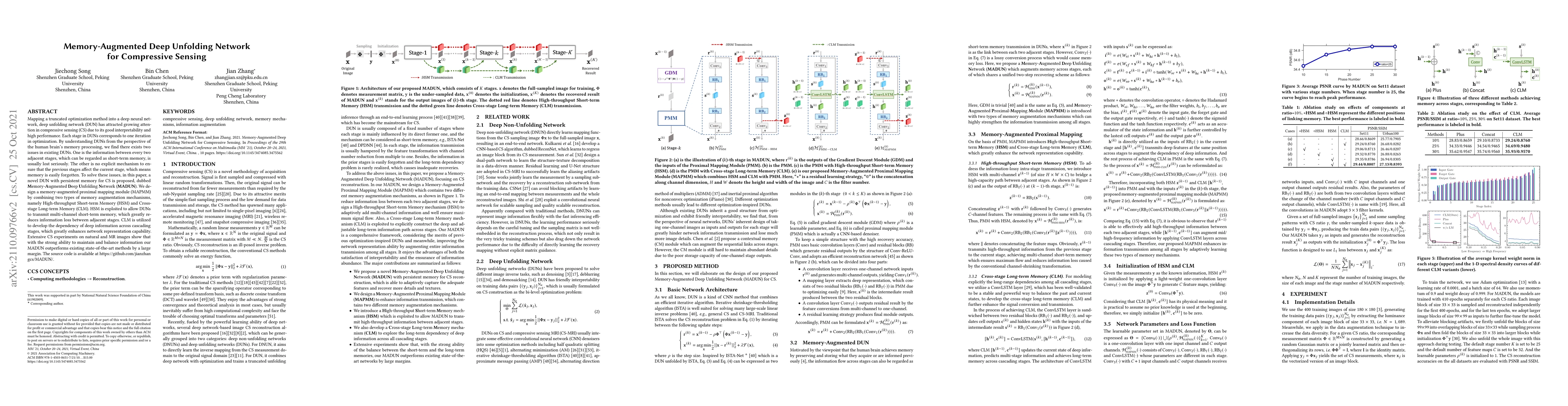 This paper proposes a Memory-Augmented Deep Unfolding Network (MADUN) to enhance compressive sensing by addressing information loss and memory retention issues in existing deep unfolding networks. The MADUN incorporates High-throughput Short-term Memory and Cross-stage Long-term Memory mechanisms, improving performance significantly over state-of-the-art methods in CS experiments.