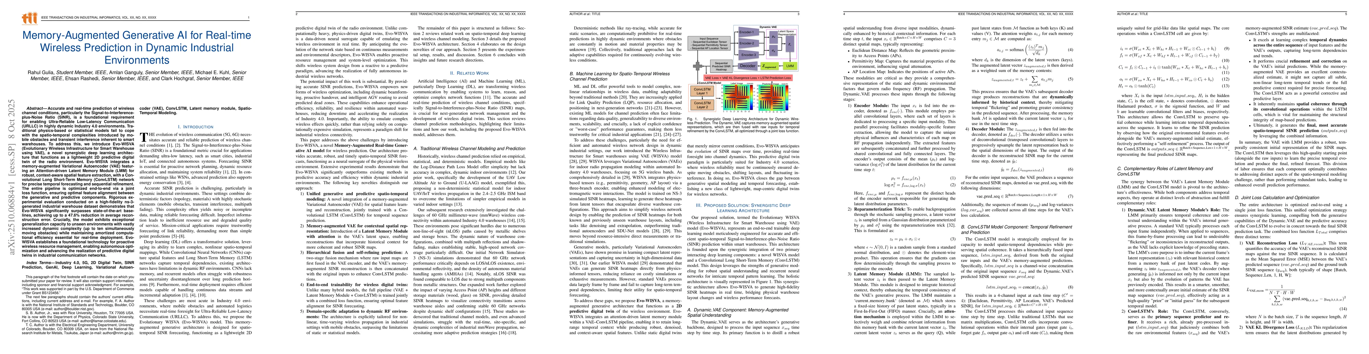Accurate and real-time prediction of wireless channel conditions, particularly the Signal-to-Interference-plus-Noise Ratio (SINR), is a foundational requirement for enabling Ultra-Reliable Low-Latency Communication (URLLC) in highly dynamic Industry 4.0 environments. Traditional physics-based or statistical models fail to cope with the spatio-temporal complexities introduced by mobile obstacles and transient interference inherent to smart warehouses. To address this, we introduce Evo-WISVA (Evolutionary Wireless Infrastructure for Smart Warehouse using VAE), a novel synergistic deep learning architecture that functions as a lightweight 2D predictive digital twin of the radio environment. Evo-WISVA integrates a memory-augmented Variational Autoencoder (VAE) featuring an Attention-driven Latent Memory Module (LMM) for robust, context-aware spatial feature extraction, with a Convolutional Long Short-Term Memory (ConvLSTM) network for precise temporal forecasting and sequential refinement. The entire pipeline is optimized end-to-end via a joint loss function, ensuring optimal feature alignment between the generative and predictive components. Rigorous experimental evaluation conducted on a high-fidelity ns-3-generated industrial warehouse dataset demonstrates that Evo-WISVA significantly surpasses state-of-the-art baselines, achieving up to a 47.6\% reduction in average reconstruction error. Crucially, the model exhibits exceptional generalization capacity to unseen environments with vastly increased dynamic complexity (up to ten simultaneously moving obstacles) while maintaining amortized computational efficiency essential for real-time deployment. Evo-WISVA establishes a foundational technology for proactive wireless resource management, enabling autonomous optimization and advancing the realization of predictive digital twins in industrial communication networks.