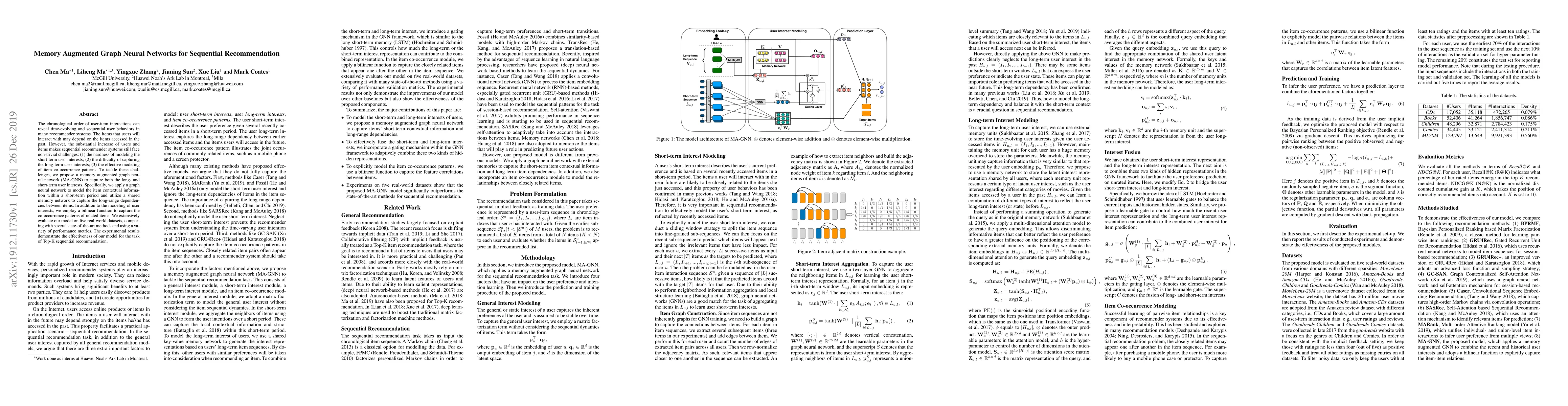 The paper proposes a memory augmented graph neural network (MA-GNN) to address challenges in sequential recommendation systems, including short-term and long-term user interest modeling and item co-occurrence patterns. Experimental results on five datasets show the effectiveness of MA-GNN for Top-K sequential recommendation.