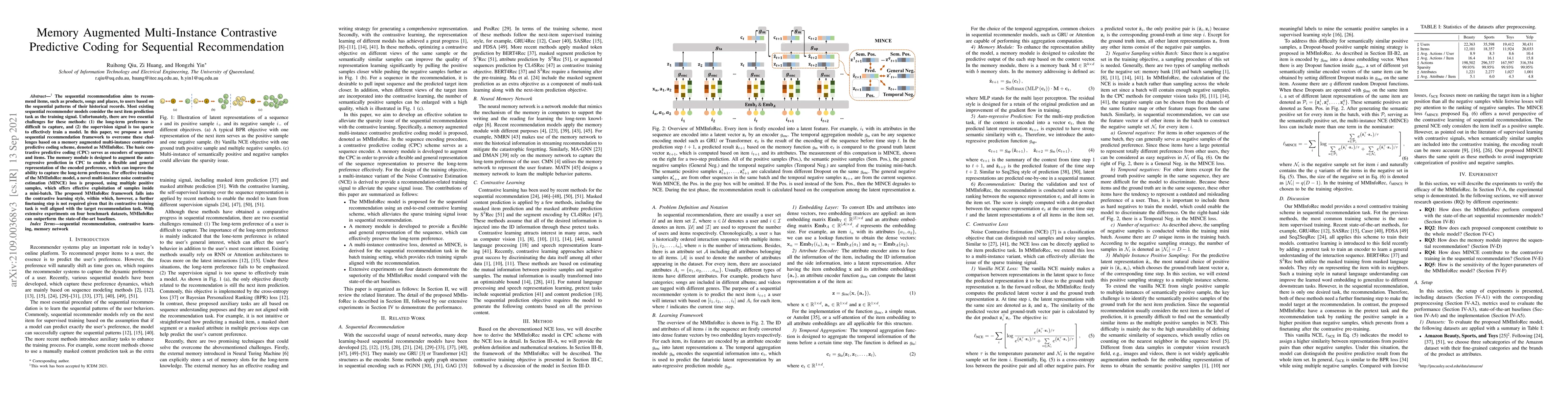 The sequential recommendation aims to recommend items, such as products, songs and places, to users based on the sequential patterns of their historical records. Most existing sequential recommender models consider the next item prediction task as the training signal. Unfortunately, there are two essential challenges for these methods: (1) the long-term preference is difficult to capture, and (2) the supervision signal is too sparse to effectively train a model. In this paper, we propose a novel sequential recommendation framework to overcome these challenges based on a memory augmented multi-instance contrastive predictive coding scheme, denoted as MMInfoRec. The basic contrastive predictive coding (CPC) serves as encoders of sequences and items. The memory module is designed to augment the auto-regressive prediction in CPC to enable a flexible and general representation of the encoded preference, which can improve the ability to capture the long-term preference. For effective training of the MMInfoRec model, a novel multi-instance noise contrastive estimation (MINCE) loss is proposed, using multiple positive samples, which offers effective exploitation of samples inside a mini-batch. The proposed MMInfoRec framework falls into the contrastive learning style, within which, however, a further finetuning step is not required given that its contrastive training task is well aligned with the target recommendation task. With extensive experiments on four benchmark datasets, MMInfoRec can outperform the state-of-the-art baselines.