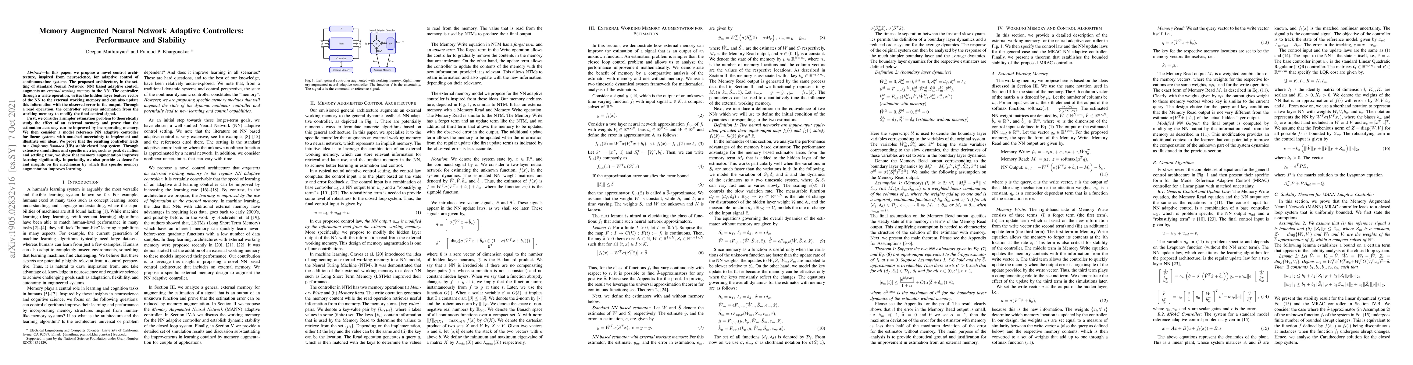 This paper introduces a novel adaptive control architecture for continuous-time systems, inspired by neuroscience, that incorporates an external working memory to a neural network. Theoretical analysis and simulations demonstrate that this memory augmentation enhances estimation accuracy and learning, leading to a uniformly bounded stable closed-loop system. The mechanism behind improved learning is also explored.
