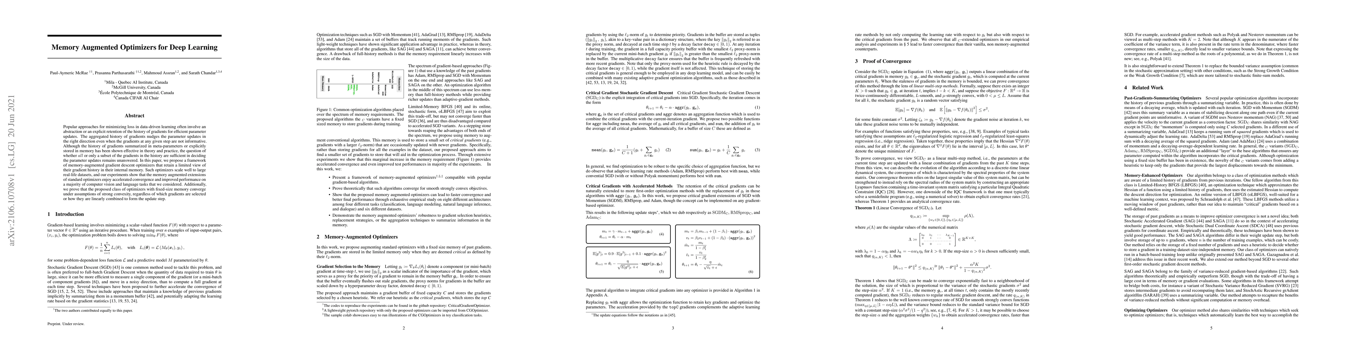 Popular approaches for minimizing loss in data-driven learning often involve an abstraction or an explicit retention of the history of gradients for efficient parameter updates. The aggregated history of gradients nudges the parameter updates in the right direction even when the gradients at any given step are not informative. Although the history of gradients summarized in meta-parameters or explicitly stored in memory has been shown effective in theory and practice, the question of whether $all$ or only a subset of the gradients in the history are sufficient in deciding the parameter updates remains unanswered. In this paper, we propose a framework of memory-augmented gradient descent optimizers that retain a limited view of their gradient history in their internal memory. Such optimizers scale well to large real-life datasets, and our experiments show that the memory augmented extensions of standard optimizers enjoy accelerated convergence and improved performance on a majority of computer vision and language tasks that we considered. Additionally, we prove that the proposed class of optimizers with fixed-size memory converge under assumptions of strong convexity, regardless of which gradients are selected or how they are linearly combined to form the update step.
