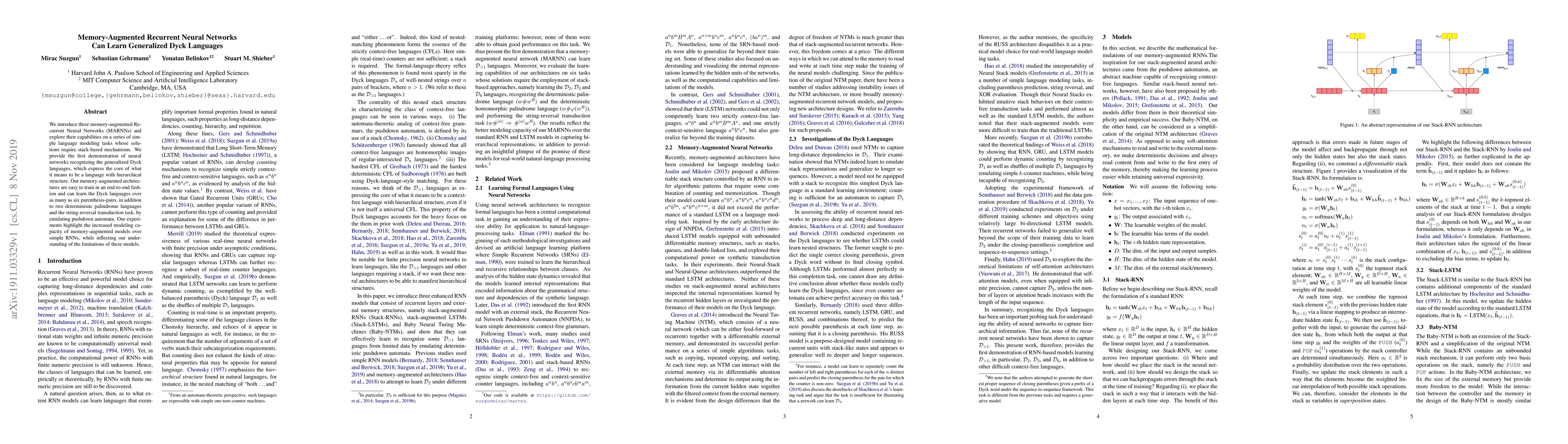 This paper introduces three memory-augmented Recurrent Neural Networks (MARNNs) that successfully learn generalized Dyck languages, demonstrating their ability to model hierarchical structures akin to stack-based mechanisms. The study highlights the superior performance of MARNNs over simple RNNs in recognizing complex languages.