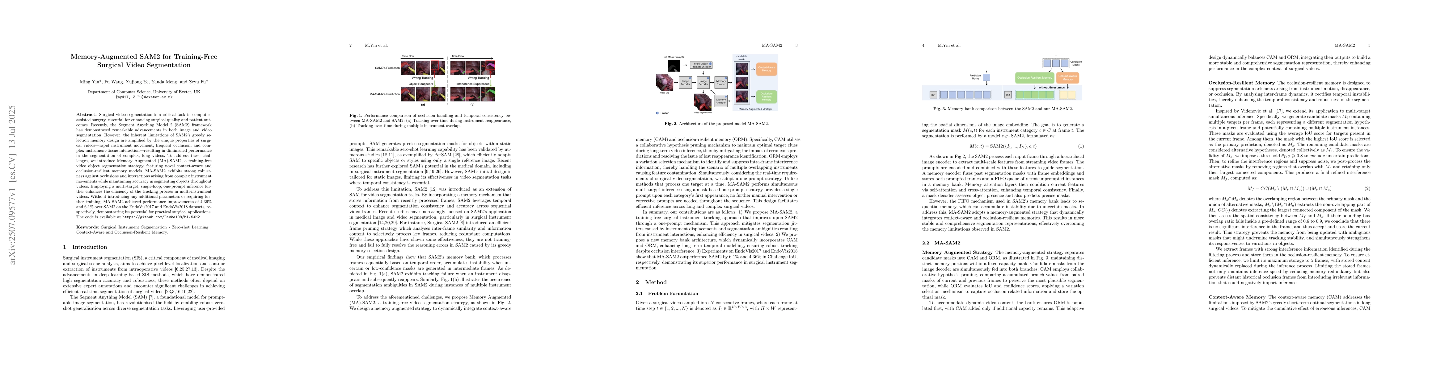 The paper introduces Memory-Augmented SAM2 (MA-SAM2), a training-free video object segmentation strategy for surgical video segmentation. MA-SAM2 features novel context-aware and occlusion-resilient memory models to address SAM2's limitations in handling complex surgical videos with rapid instrument movements, frequent occlusions, and complex instrument-tissue interactions.