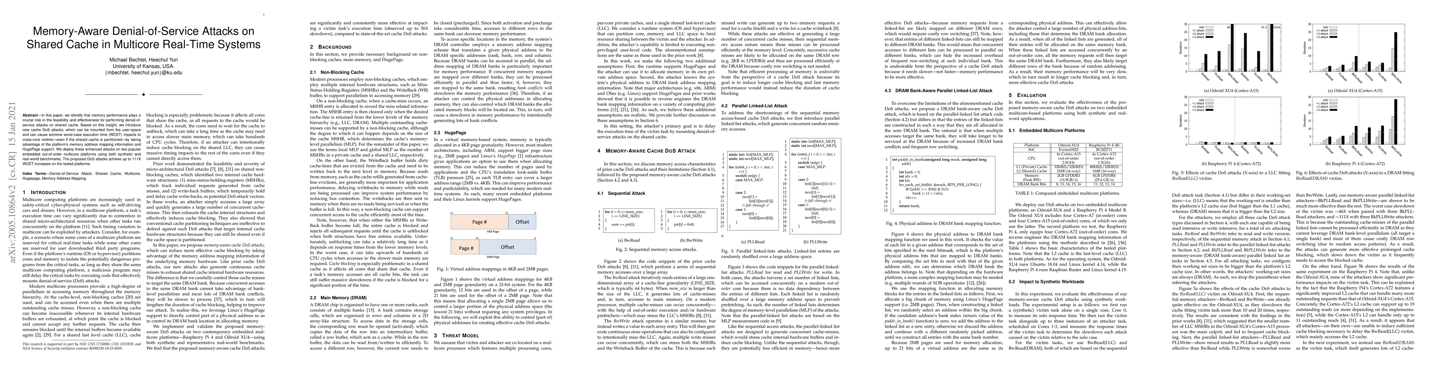 This research introduced memory-aware cache DoS attacks that leverage a system's memory address mapping information and Huge Pages support to induce prolonged cache blocking.