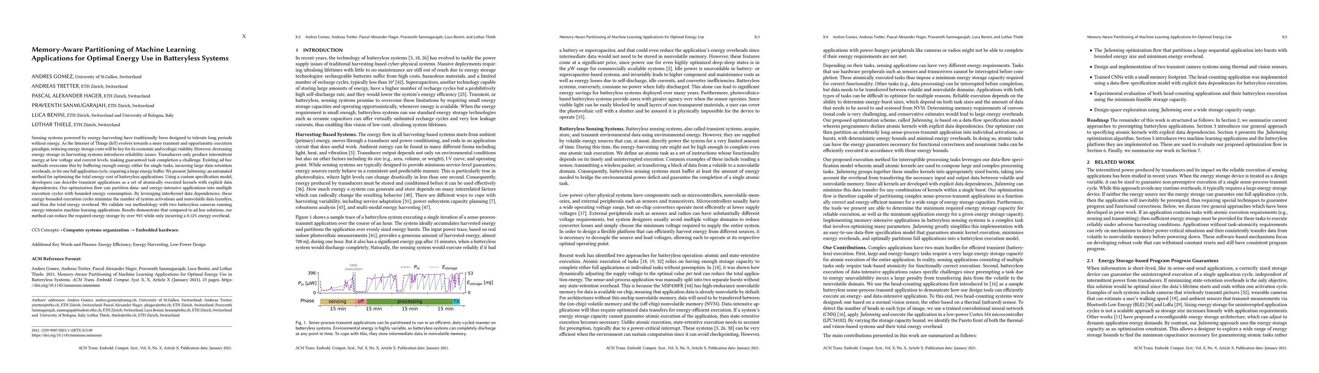 This paper introduces Julienning, a method for optimizing energy use in batteryless IoT systems by partitioning machine learning applications into multiple execution cycles with bounded energy consumption. The approach minimizes energy overhead by leveraging interkernel data dependencies, reducing the required energy storage by over 94% compared to ad hoc solutions.