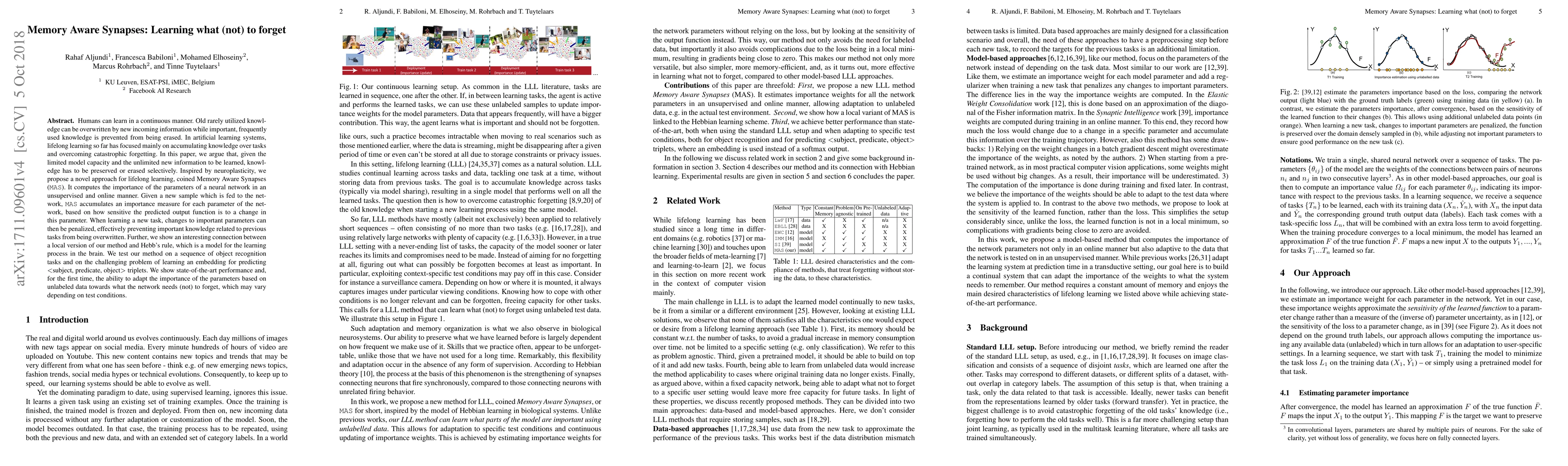 Humans can learn in a continuous manner. Old rarely utilized knowledge can be overwritten by new incoming information while important, frequently used knowledge is prevented from being erased. In artificial learning systems, lifelong learning so far has focused mainly on accumulating knowledge over tasks and overcoming catastrophic forgetting. In this paper, we argue that, given the limited model capacity and the unlimited new information to be learned, knowledge has to be preserved or erased selectively. Inspired by neuroplasticity, we propose a novel approach for lifelong learning, coined Memory Aware Synapses (MAS). It computes the importance of the parameters of a neural network in an unsupervised and online manner. Given a new sample which is fed to the network, MAS accumulates an importance measure for each parameter of the network, based on how sensitive the predicted output function is to a change in this parameter. When learning a new task, changes to important parameters can then be penalized, effectively preventing important knowledge related to previous tasks from being overwritten. Further, we show an interesting connection between a local version of our method and Hebb's rule,which is a model for the learning process in the brain. We test our method on a sequence of object recognition tasks and on the challenging problem of learning an embedding for predicting $<$subject, predicate, object$>$ triplets. We show state-of-the-art performance and, for the first time, the ability to adapt the importance of the parameters based on unlabeled data towards what the network needs (not) to forget, which may vary depending on test conditions.