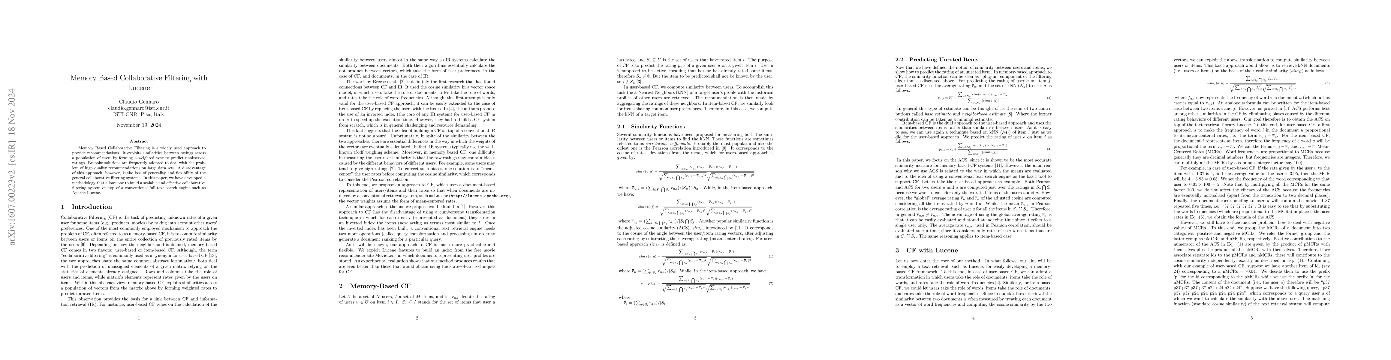 This paper proposes a scalable methodology for Memory Based Collaborative Filtering using Apache Lucene, enabling effective recommendation systems without sacrificing the generality and flexibility of traditional collaborative filtering approaches.