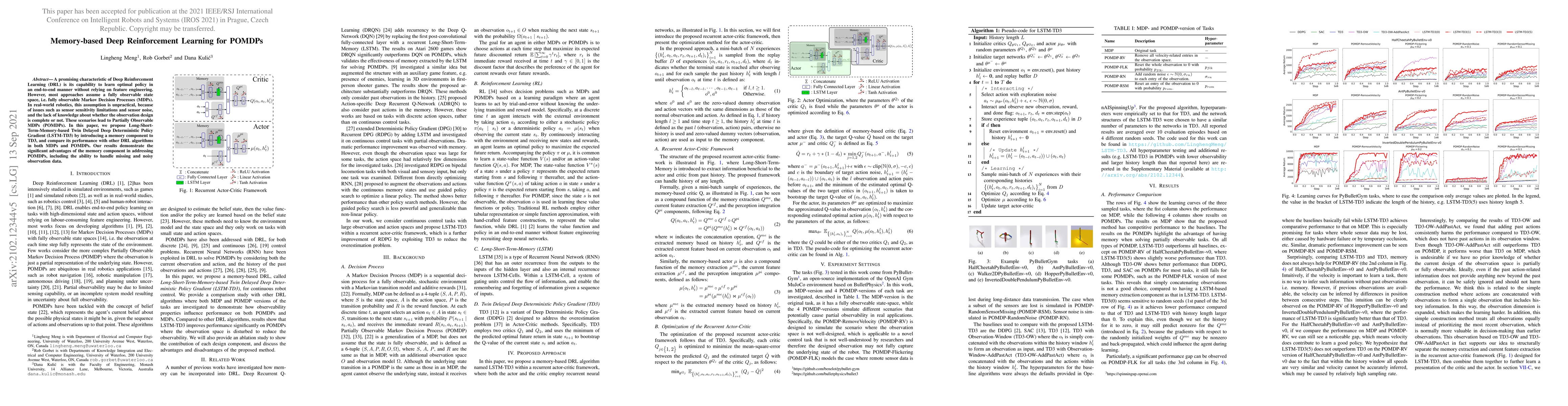 A promising characteristic of Deep Reinforcement Learning (DRL) is its capability to learn optimal policy in an end-to-end manner without relying on feature engineering. However, most approaches assume a fully observable state space, i.e. fully observable Markov Decision Processes (MDPs). In real-world robotics, this assumption is unpractical, because of issues such as sensor sensitivity limitations and sensor noise, and the lack of knowledge about whether the observation design is complete or not. These scenarios lead to Partially Observable MDPs (POMDPs). In this paper, we propose Long-Short-Term-Memory-based Twin Delayed Deep Deterministic Policy Gradient (LSTM-TD3) by introducing a memory component to TD3, and compare its performance with other DRL algorithms in both MDPs and POMDPs. Our results demonstrate the significant advantages of the memory component in addressing POMDPs, including the ability to handle missing and noisy observation data.