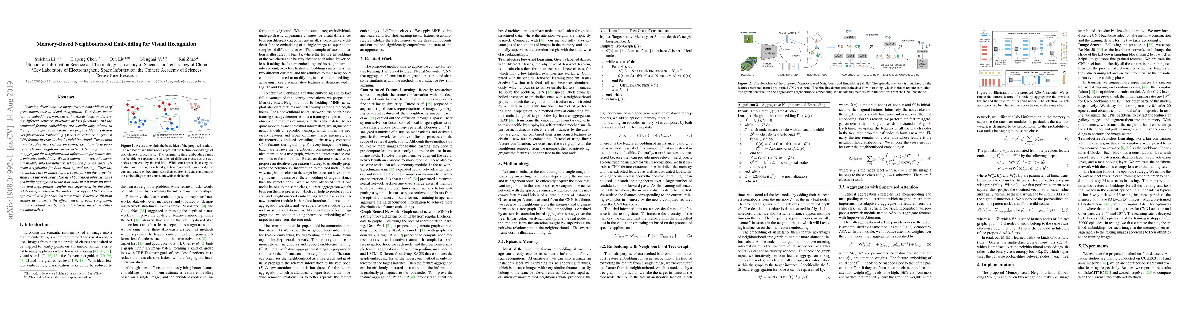 This paper introduces Memory-based Neighbourhood Embedding (MNE) to enhance CNN feature embeddings by incorporating neighbourhood information through an episodic memory module. The method aggregates neighbourhood data in a tree graph to improve discriminative power, achieving superior results in image search and few-shot learning tasks.
