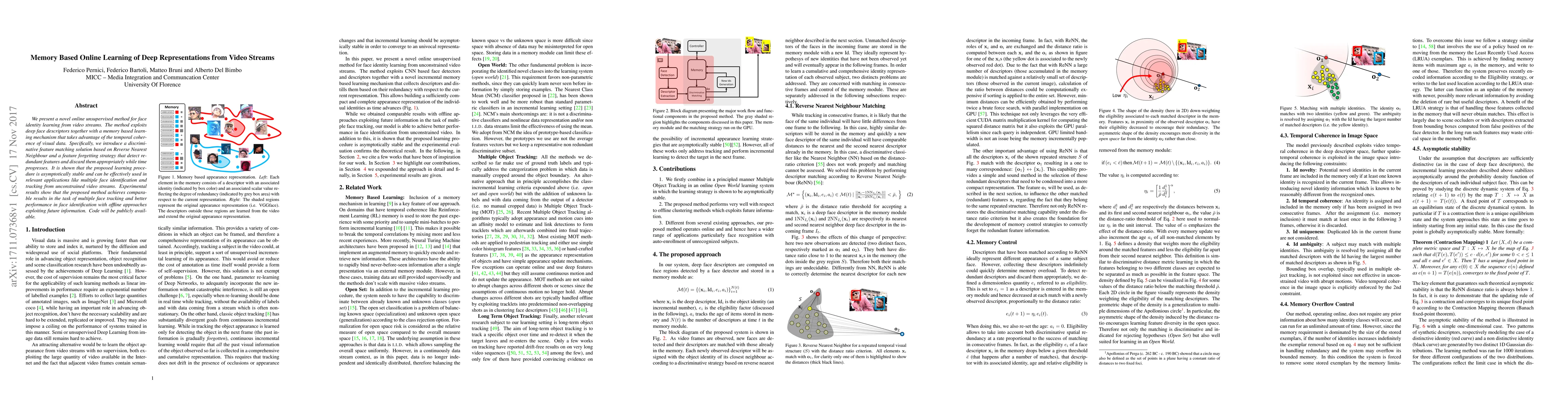 This paper introduces an online unsupervised method for learning deep face representations from video streams using temporal coherence and memory-based learning. The approach combines discriminative feature matching and a feature forgetting strategy to enhance face identity learning, demonstrating stability and effectiveness in multiple face identification and tracking.