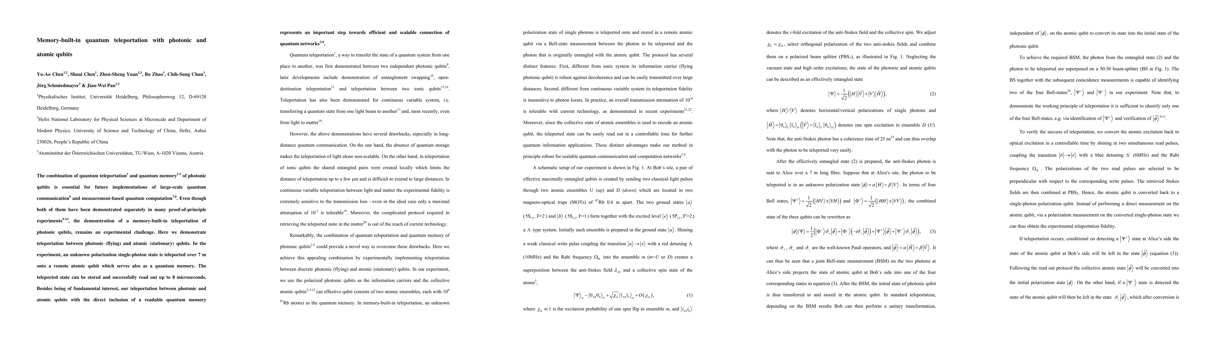 This paper demonstrates the first memory-built-in quantum teleportation, successfully transferring a photonic qubit's state to a remote atomic qubit that functions as a quantum memory, enabling storage and readout of the teleported state for up to 8 microseconds. This achievement is a significant step towards scalable quantum networks.