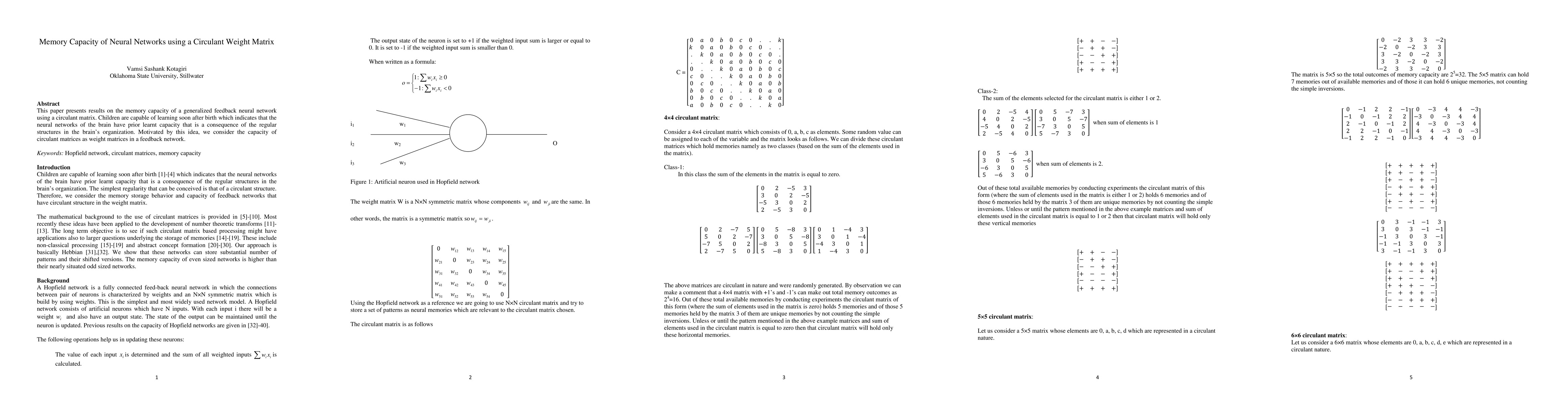 This paper presents results on the memory capacity of a generalized feedback neural network using a circulant matrix. Children are capable of learning soon after birth which indicates that the neural networks of the brain have prior learnt capacity that is a consequence of the regular structures in the brain's organization. Motivated by this idea, we consider the capacity of circulant matrices as weight matrices in a feedback network.