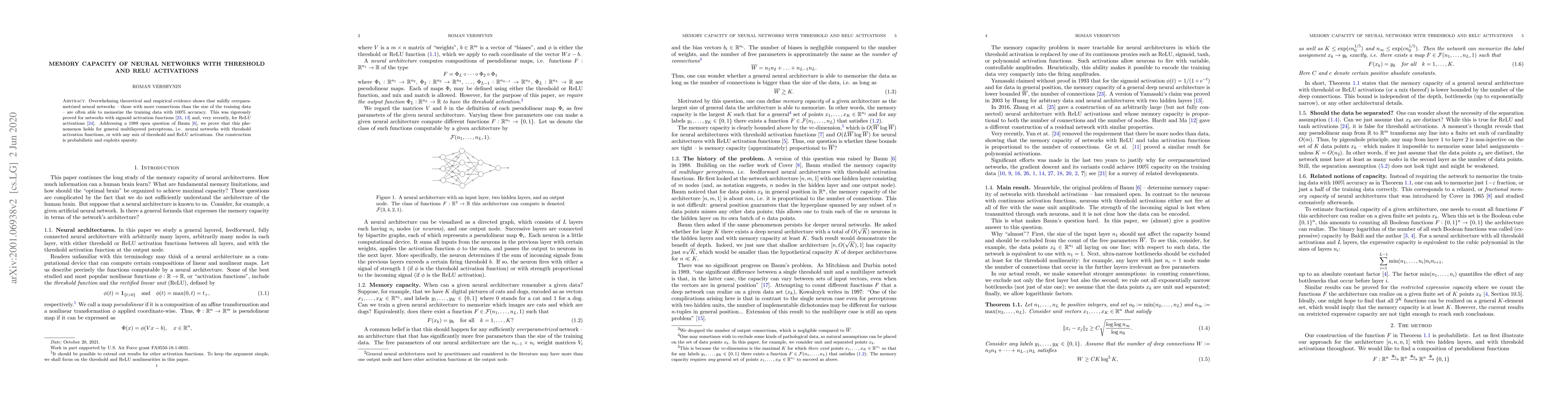 This paper proves that mildly overparametrized neural networks with threshold and ReLU activations can memorize training data perfectly, extending previous results for sigmoid and ReLU networks. The proof leverages probabilistic constructions that exploit sparsity.