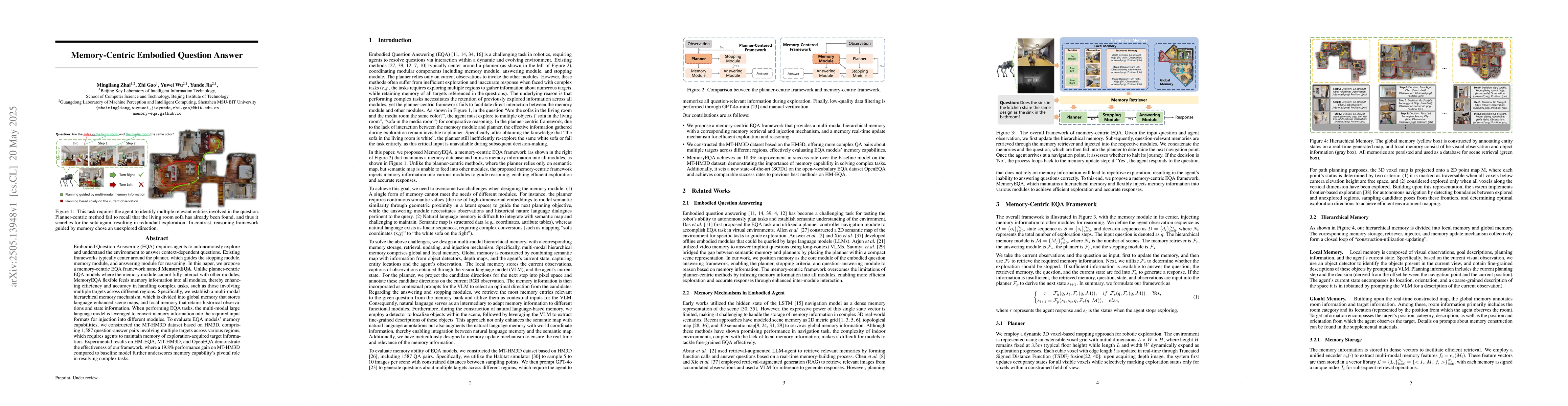 Embodied Question Answering (EQA) requires agents to autonomously explore and understand the environment to answer context-dependent questions. Existing frameworks typically center around the planner, which guides the stopping module, memory module, and answering module for reasoning. In this paper, we propose a memory-centric EQA framework named MemoryEQA. Unlike planner-centric EQA models where the memory module cannot fully interact with other modules, MemoryEQA flexible feeds memory information into all modules, thereby enhancing efficiency and accuracy in handling complex tasks, such as those involving multiple targets across different regions. Specifically, we establish a multi-modal hierarchical memory mechanism, which is divided into global memory that stores language-enhanced scene maps, and local memory that retains historical observations and state information. When performing EQA tasks, the multi-modal large language model is leveraged to convert memory information into the required input formats for injection into different modules. To evaluate EQA models' memory capabilities, we constructed the MT-HM3D dataset based on HM3D, comprising 1,587 question-answer pairs involving multiple targets across various regions, which requires agents to maintain memory of exploration-acquired target information. Experimental results on HM-EQA, MT-HM3D, and OpenEQA demonstrate the effectiveness of our framework, where a 19.8% performance gain on MT-HM3D compared to baseline model further underscores memory capability's pivotal role in resolving complex tasks.