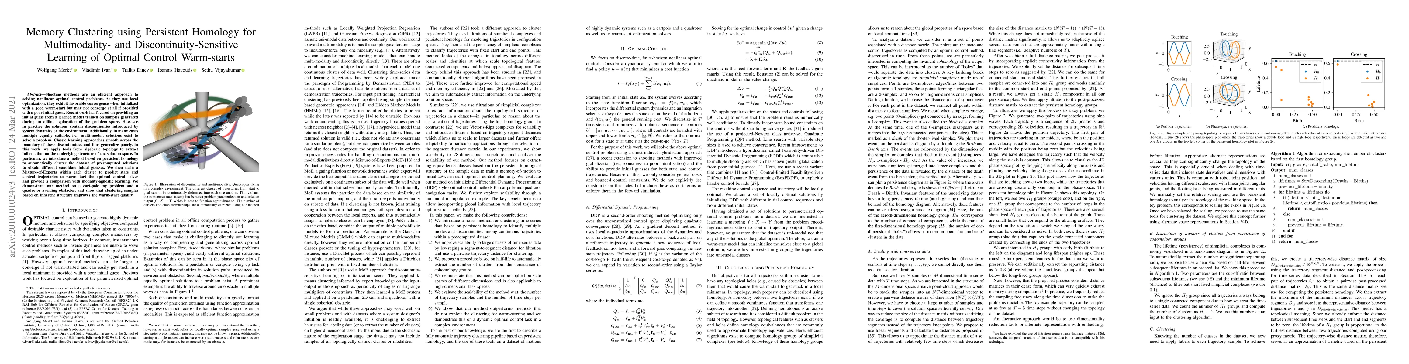 This paper proposes using persistent homology to cluster precomputed solutions for optimal control problems, enabling multimodal and discontinuity-sensitive learning of warm-starts. The method improves the quality of initial guesses compared to modality-agnostic approaches, demonstrated through cart-pole and quadrotor obstacle avoidance tasks.