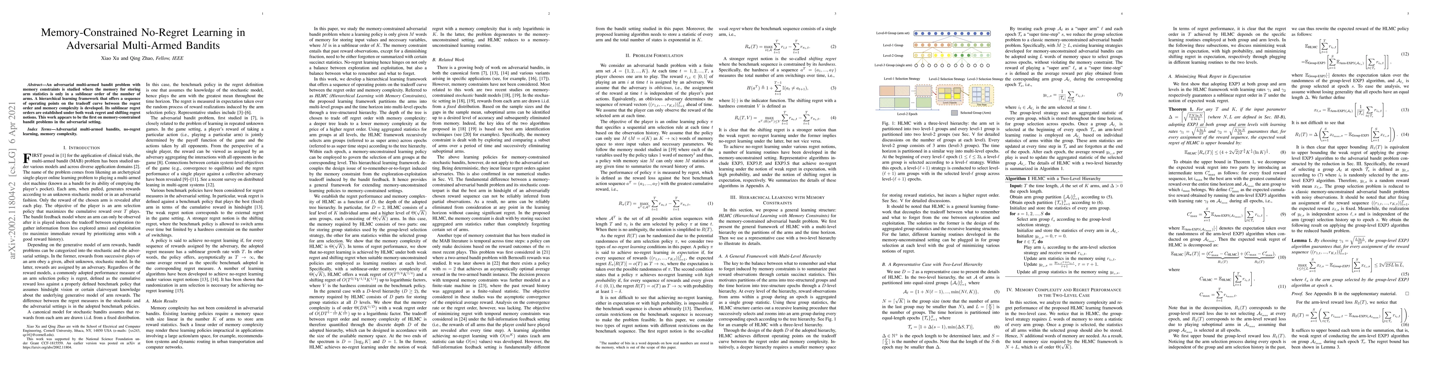 Researchers developed a learning policy for an adversarial bandit problem with memory constraints, achieving sublinear regret orders with limited storage space. This work establishes a new approach to memory-constrained bandit problems under the adversarial setting.