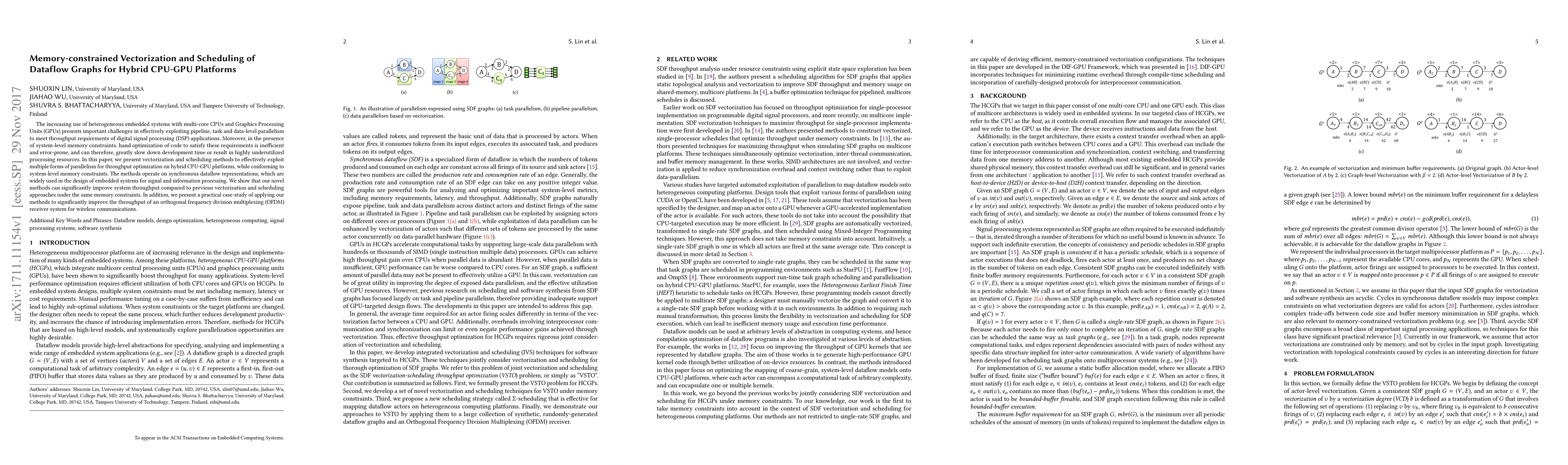 This paper proposes vectorization and scheduling methods for optimizing throughput in hybrid CPU-GPU systems, focusing on memory-constrained environments. It demonstrates significant improvements over previous approaches through a case study on an OFDM receiver system.