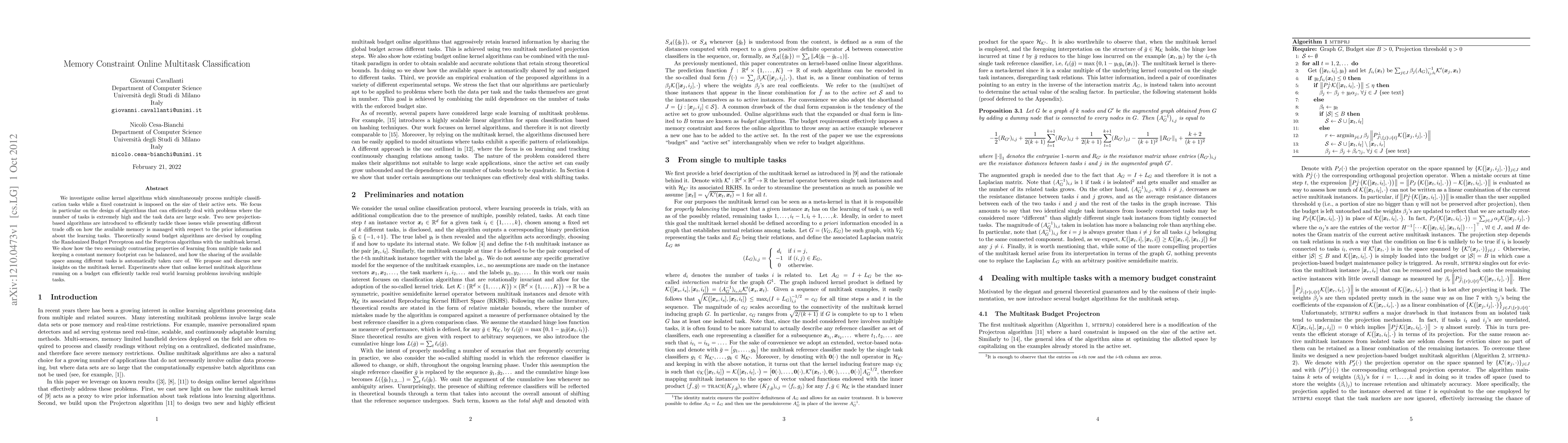 We investigate online kernel algorithms which simultaneously process multiple classification tasks while a fixed constraint is imposed on the size of their active sets. We focus in particular on the design of algorithms that can efficiently deal with problems where the number of tasks is extremely high and the task data are large scale. Two new projection-based algorithms are introduced to efficiently tackle those issues while presenting different trade offs on how the available memory is managed with respect to the prior information about the learning tasks. Theoretically sound budget algorithms are devised by coupling the Randomized Budget Perceptron and the Forgetron algorithms with the multitask kernel. We show how the two seemingly contrasting properties of learning from multiple tasks and keeping a constant memory footprint can be balanced, and how the sharing of the available space among different tasks is automatically taken care of. We propose and discuss new insights on the multitask kernel. Experiments show that online kernel multitask algorithms running on a budget can efficiently tackle real world learning problems involving multiple tasks.