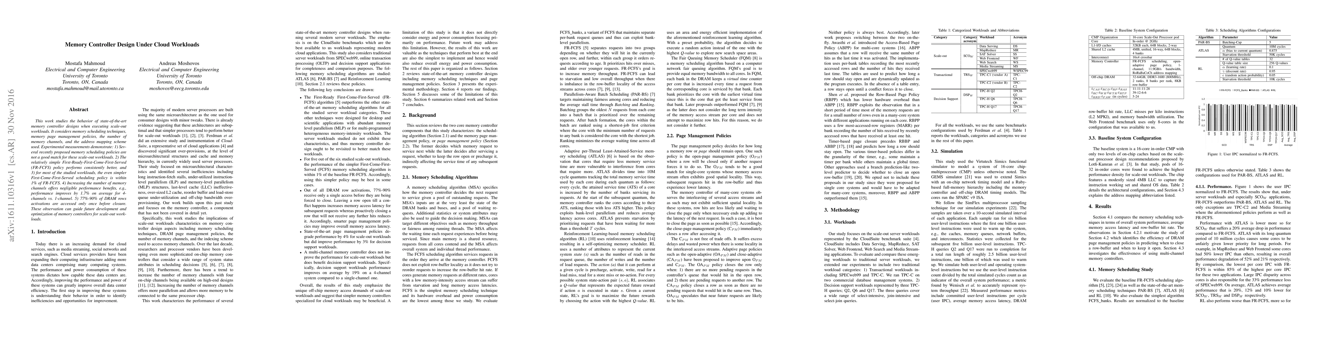 This research evaluates memory controller design under cloud scale-out workloads, finding that simple scheduling policies like First-Come-First-Served perform nearly as well as more complex ones, while increasing memory channels provides minimal benefits.