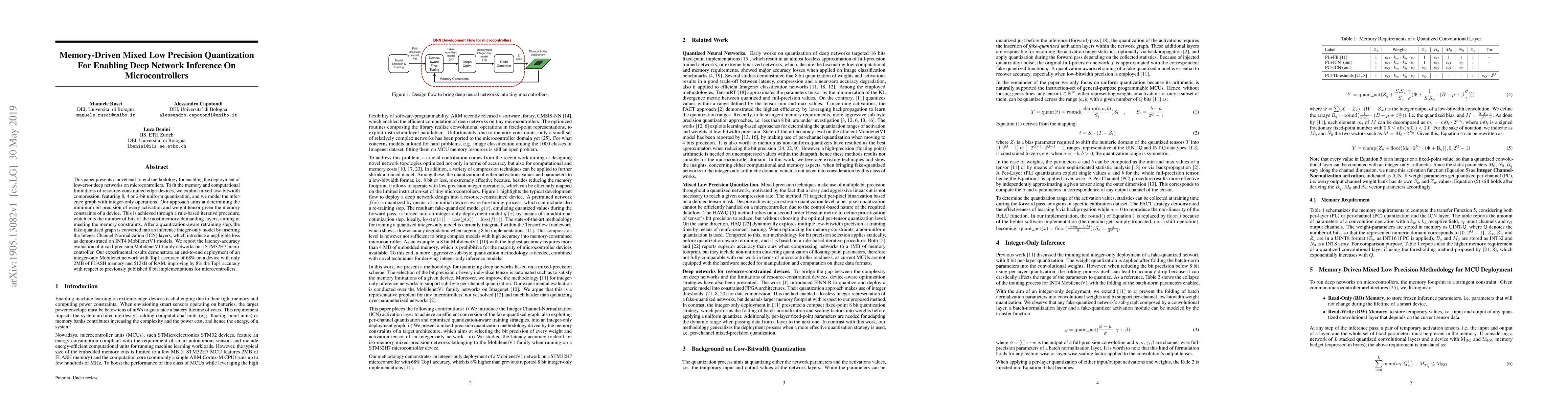 This paper introduces a memory-driven mixed low-precision quantization methodology to deploy deep networks efficiently on microcontrollers, using 8, 4, or 2-bit quantization and integer-only operations. It achieves high accuracy with minimal memory use, demonstrating a 68% Top1 accuracy on a STM32H7 with 2MB FLASH and 512kB RAM, outperforming previous 8-bit implementations by 8%.