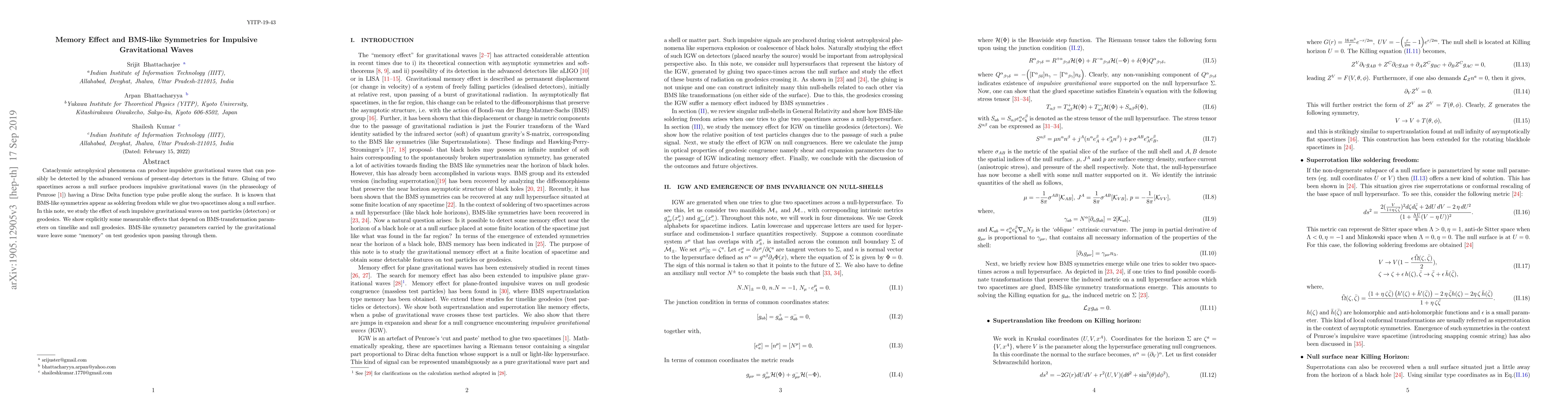This paper investigates impulsive gravitational waves produced by cataclysmic astrophysical events, focusing on their impact on test particles and geodesics. It reveals measurable effects linked to BMS-like symmetries, demonstrating that these waves leave a "memory" on the geodesics based on BMS-transformation parameters.