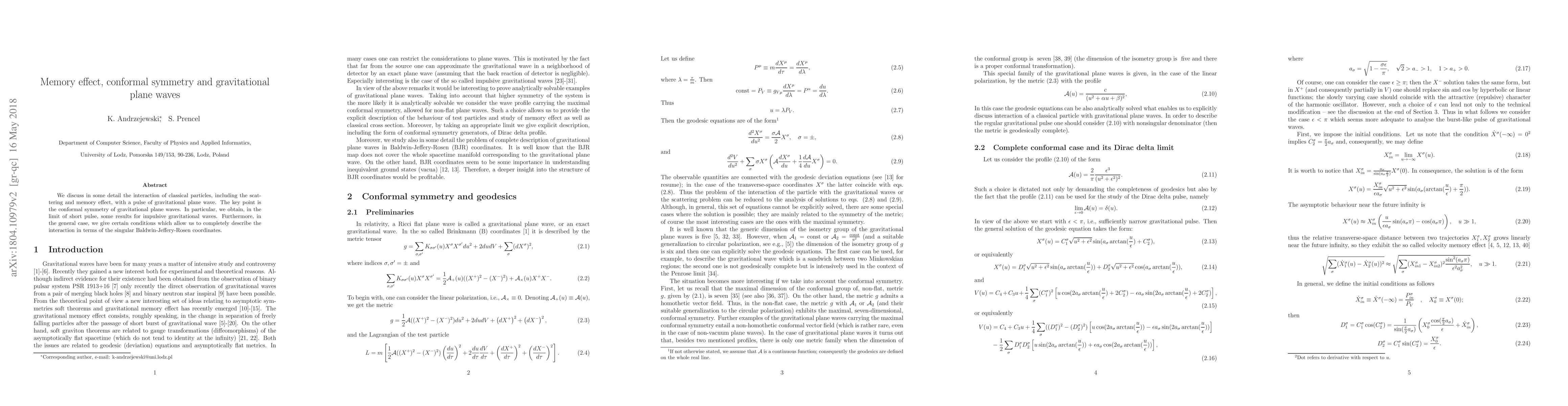 This paper investigates the interaction of classical particles with gravitational plane waves, focusing on the scattering and memory effect under conformal symmetry. It presents results for impulsive gravitational waves in the short pulse limit and describes the interaction in singular Baldwin-Jeffery-Rosen coordinates.