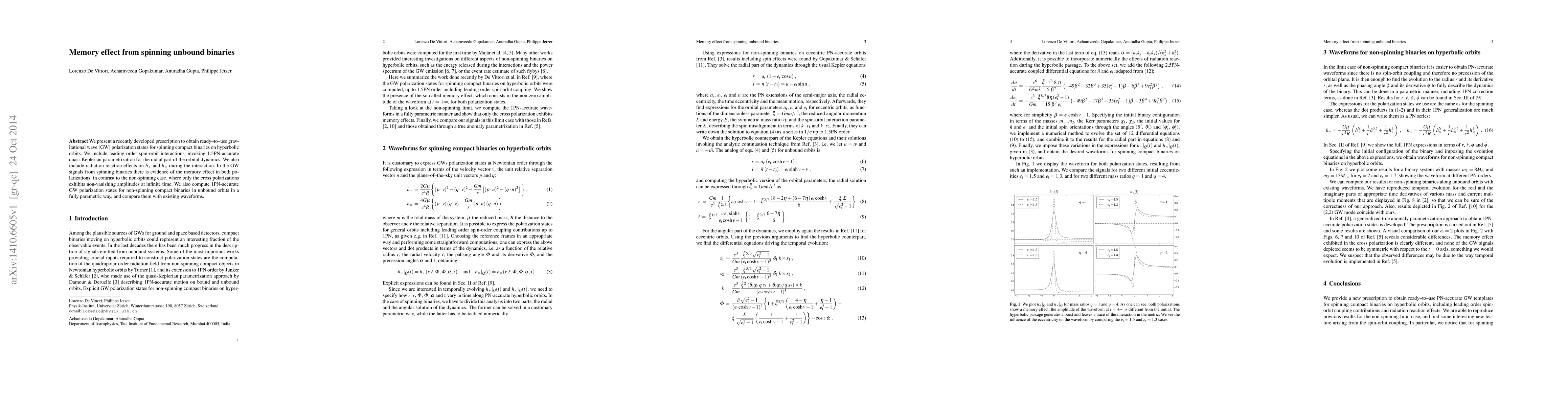 We present a recently developed prescription to obtain ready-to-use gravitational wave (GW) polarization states for spinning compact binaries on hyperbolic orbits. We include leading order spin-orbit interactions, invoking 1.5PN-accurate quasi-Keplerian parametrization for the radial part of the orbital dynamics. We also include radiation reaction effects on $h_+$ and $h_{\times}$ during the interaction. In the GW signals from spinning binaries there is evidence of the memory effect in both polarizations, in contrast to the non-spinning case, where only the cross polarizations exhibits non-vanishing amplitudes at infinite time. We also compute 1PN-accurate GW polarization states for non-spinning compact binaries in unbound orbits in a fully parametric way, and compare them with existing waveforms.