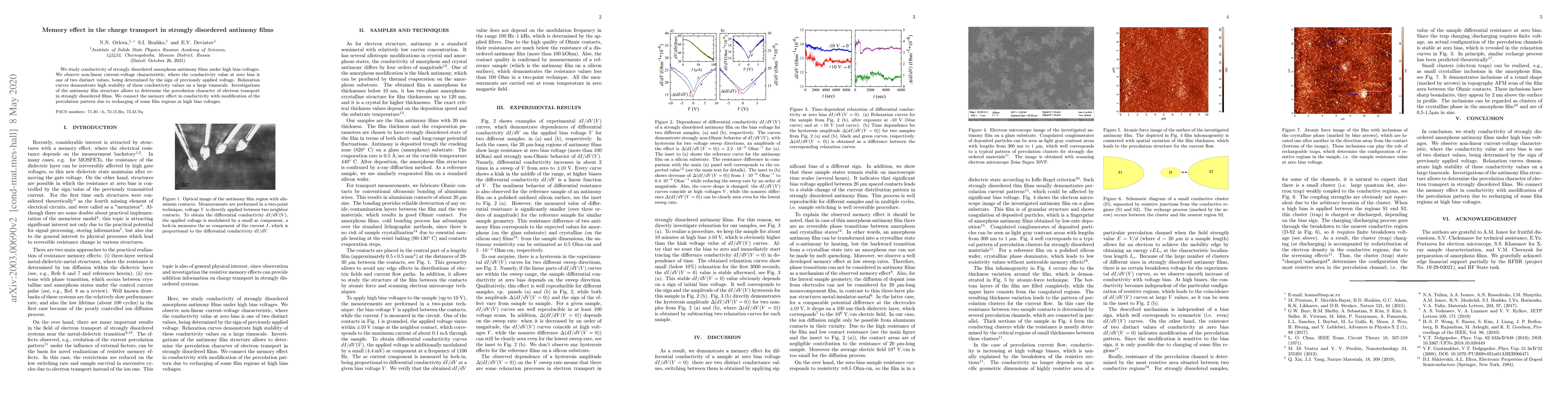 Researchers studied the conductivity of disordered antimony films under high bias voltages, finding a memory effect where previous voltage application determines the film's conductivity value at zero bias.