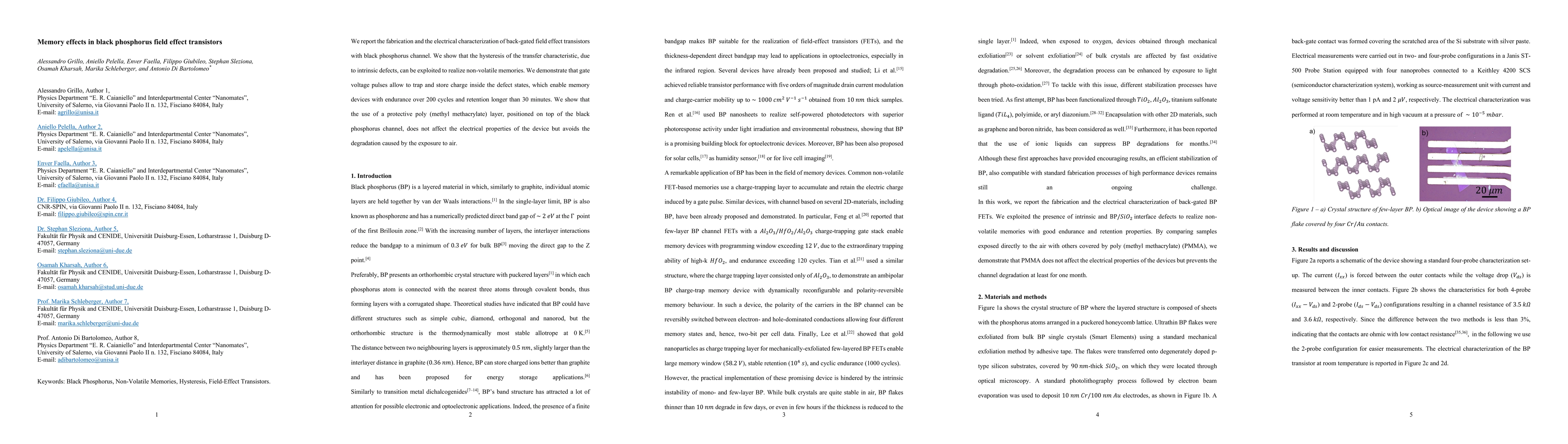 This paper presents black phosphorus field effect transistors exhibiting memory effects due to intrinsic defects, enabling non-volatile memory with over 200 cycle endurance and retention longer than 30 minutes. A protective poly (methyl methacrylate) layer maintains device performance while preventing air degradation.