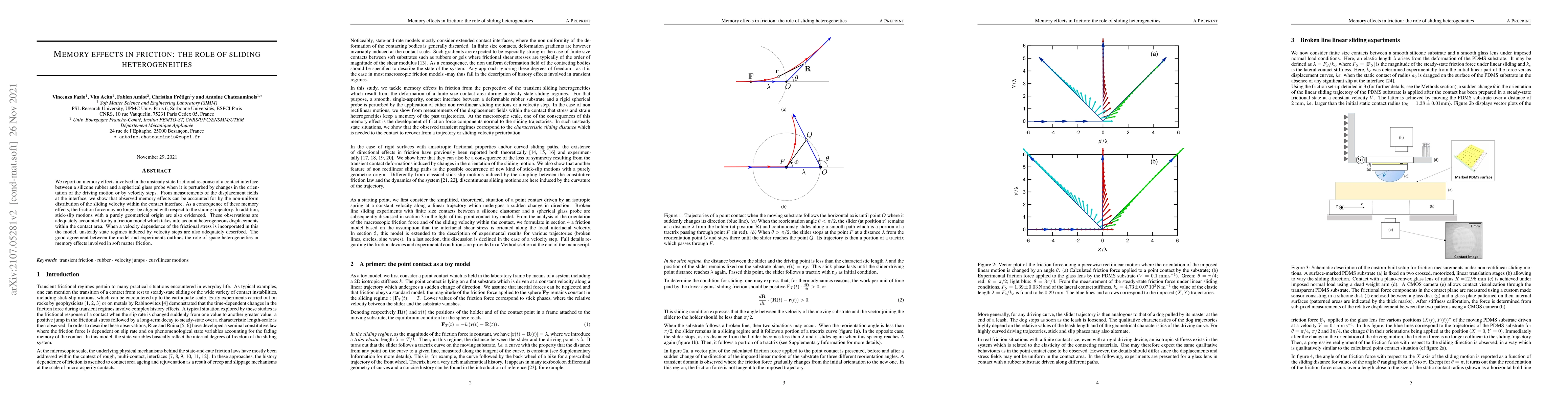 We report on memory effects involved in the transient frictional response of a contact interface between a silicone rubber and a spherical glass probe when it is perturbed by changes in the orientation of the driving motion or by velocity steps. From measurements of the displacement fields at the interface, we show that observed memory effects can be accounted for by the non-uniform distribution of the sliding velocity within the contact interface. As a consequence of these memory effects, the friction force may no longer be aligned with respect to the sliding trajectory. In addition, stick-slip motions with a purely geometrical origin are also evidenced. These observations are adequately accounted for by a friction model which takes into account heterogeneous displacements within the contact area. When a velocity dependence of the frictional stress is incorporated in this the model, transient regimes induced by velocity steps are also adequately described. The good agreement between the model and experiments outlines the role of space heterogeneities in memory effects involved in soft matter friction.