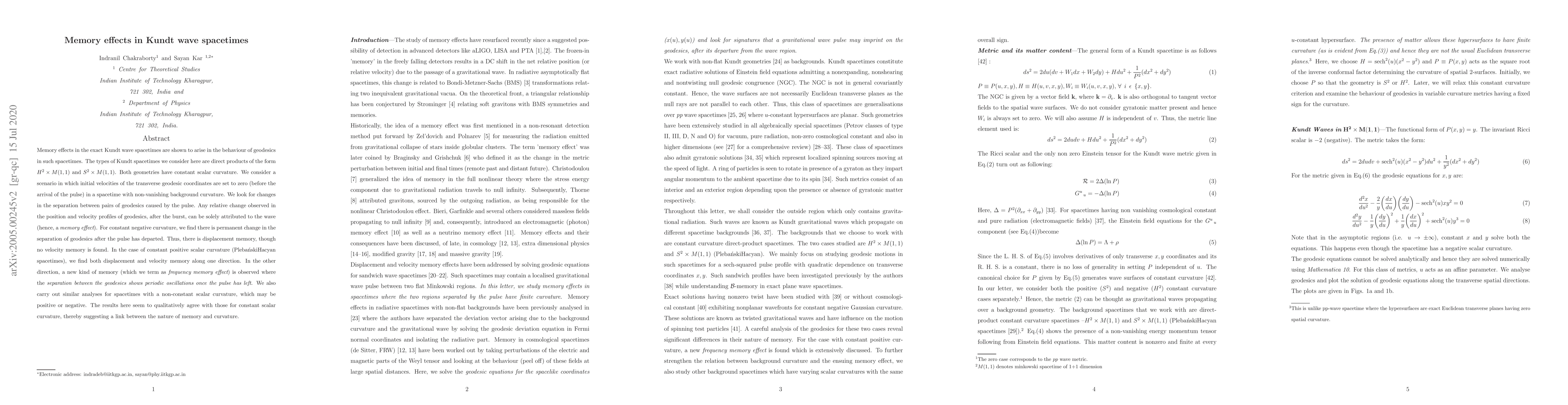 Memory effects in the exact Kundt wave spacetimes are shown to arise in the behaviour of geodesics in such spacetimes. The types of Kundt spacetimes we consider here are direct products of the form $H^2\times M(1,1)$ and $S^2\times M(1,1)$. Both geometries have constant scalar curvature. We consider a scenario in which initial velocities of the transverse geodesic coordinates are set to zero (before the arrival of the pulse) in a spacetime with non-vanishing background curvature. We look for changes in the separation between pairs of geodesics caused by the pulse. Any relative change observed in the position and velocity profiles of geodesics, after the burst, can be solely attributed to the wave (hence, a memory effect). For constant negative curvature, we find there is permanent change in the separation of geodesics after the pulse has departed. Thus, there is displacement memory, though no velocity memory is found. In the case of constant positive scalar curvature (Pleba\'nski-Hacyan spacetimes), we find both displacement and velocity memory along one direction. In the other direction, a new kind of memory (which we term as frequency memory effect) is observed where the separation between the geodesics shows periodic oscillations once the pulse has left. We also carry out similar analyses for spacetimes with a non-constant scalar curvature, which may be positive or negative. The results here seem to qualitatively agree with those for constant scalar curvature, thereby suggesting a link between the nature of memory and curvature.