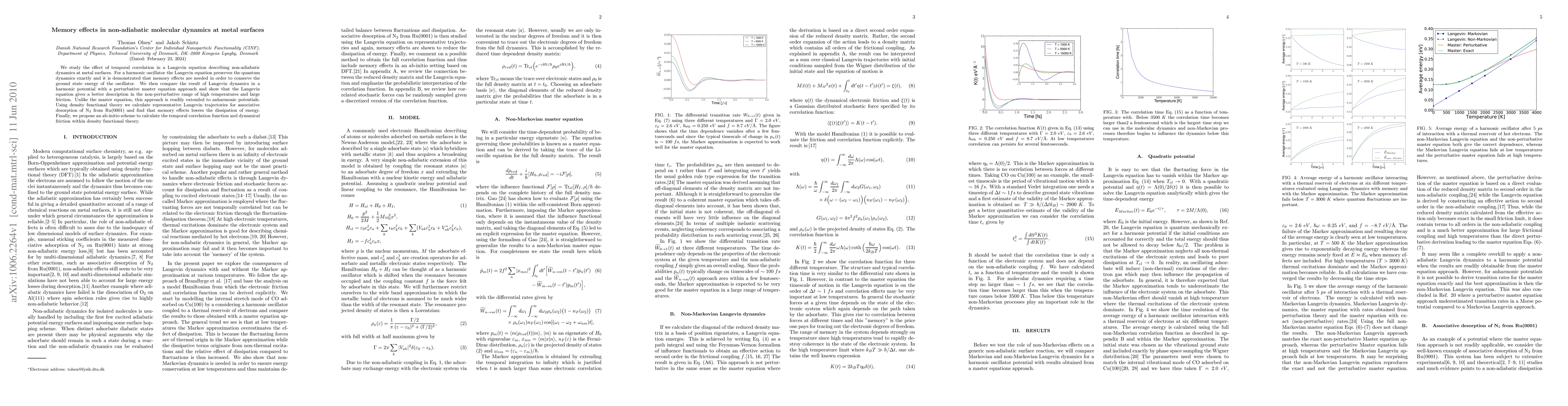 We study the effect of temporal correlation in a Langevin equation describing non-adiabatic dynamics at metal surfaces. For a harmonic oscillator the Langevin equation preserves the quantum dynamics exactly and it is demonstrated that memory effects are needed in order to conserve the ground state energy of the oscillator. We then compare the result of Langevin dynamics in a harmonic potential with a perturbative master equation approach and show that the Langevin equation gives a better description in the non-perturbative range of high temperatures and large friction. Unlike the master equation, this approach is readily extended to anharmonic potentials. Using density functional theory we calculate representative Langevin trajectories for associative desorption of N$_2$ from Ru(0001) and find that memory effects lowers the dissipation of energy. Finally, we propose an ab-initio scheme to calculate the temporal correlation function and dynamical friction within density functional theory.