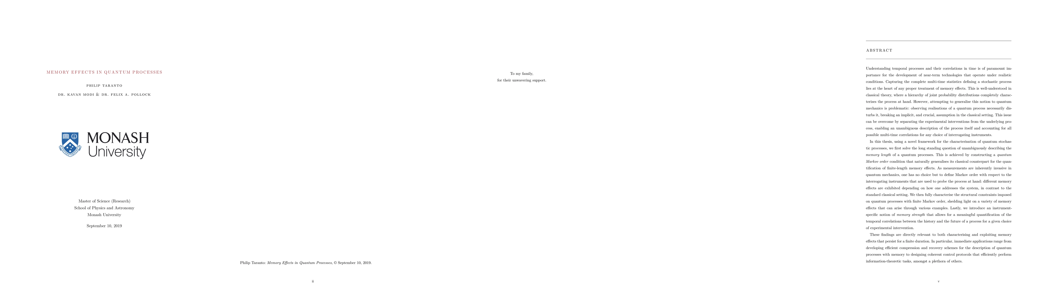 Understanding temporal processes and their correlations in time is of paramount importance for the development of near-term technologies that operate under realistic conditions. Capturing the complete multi-time statistics defining a stochastic process lies at the heart of any proper treatment of memory effects. In this thesis, using a novel framework for the characterisation of quantum stochastic processes, we first solve the long standing question of unambiguously describing the memory length of a quantum processes. This is achieved by constructing a quantum Markov order condition that naturally generalises its classical counterpart for the quantification of finite-length memory effects. As measurements are inherently invasive in quantum mechanics, one has no choice but to define Markov order with respect to the interrogating instruments that are used to probe the process at hand: different memory effects are exhibited depending on how one addresses the system, in contrast to the standard classical setting. We then fully characterise the structural constraints imposed on quantum processes with finite Markov order, shedding light on a variety of memory effects that can arise through various examples. Lastly, we introduce an instrument-specific notion of memory strength that allows for a meaningful quantification of the temporal correlations between the history and the future of a process for a given choice of experimental intervention. These findings are directly relevant to both characterising and exploiting memory effects that persist for a finite duration. In particular, immediate applications range from developing efficient compression and recovery schemes for the description of quantum processes with memory to designing coherent control protocols that efficiently perform information-theoretic tasks, amongst a plethora of others.
