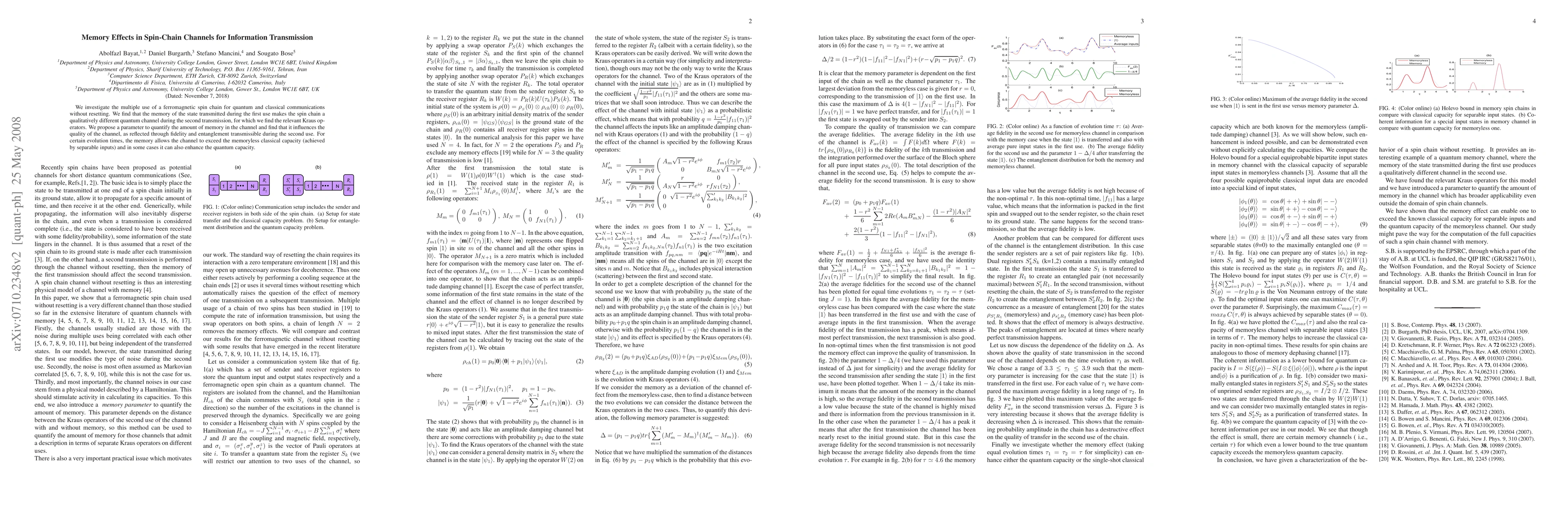 We investigate the multiple use of a ferromagnetic spin chain for quantum and classical communications without resetting. We find that the memory of the state transmitted during the first use makes the spin chain a qualitatively different quantum channel during the second transmission, for which we find the relevant Kraus operators. We propose a parameter to quantify the amount of memory in the channel and find that it influences the quality of the channel, as reflected through fidelity and entanglement transmissible during the second use. For certain evolution times, the memory allows the channel to exceed the memoryless classical capacity (achieved by separable inputs) and in some cases it can also enhance the quantum capacity.