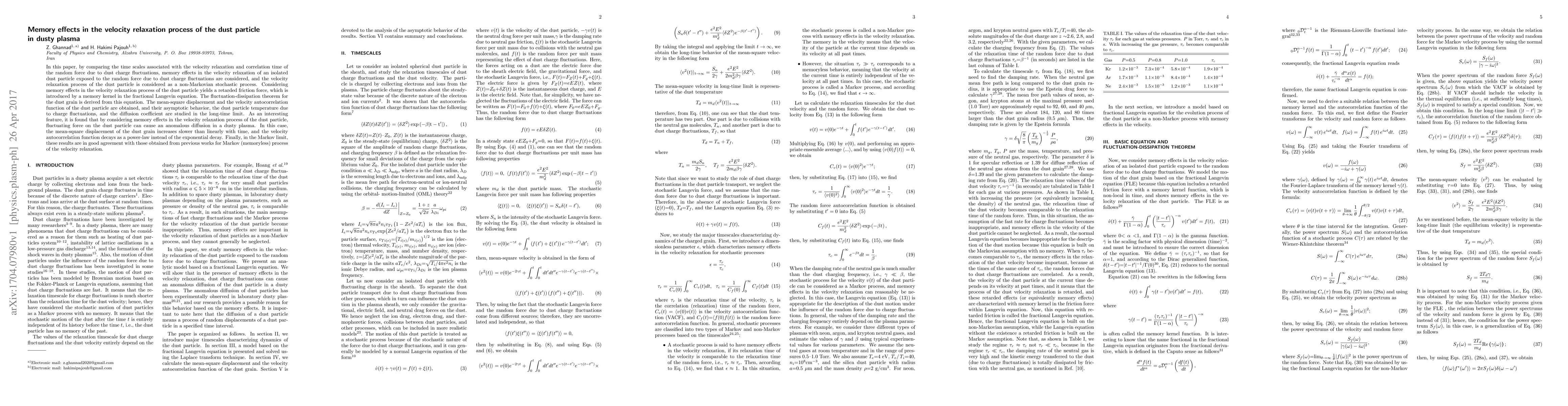 In this paper, by comparing the time scales associated with the velocity relaxation and correlation time of the random force due to dust charge fluctuations, memory effects in the velocity relaxation of an isolated dust particle exposed to the random force due to dust charge fluctuations are considered, and the velocity relaxation process of the dust particle is considered as a non-Markovian stochastic process. Considering memory effects in the velocity relaxation process of the dust particle yields a retarded friction force, which is introduced by a memory kernel in the fractional Langevin equation. The fluctuation-dissipation theorem for the dust grain is derived from this equation. The mean-square displacement and the velocity autocorrelation function of the dust particle are obtained, and their asymptotic behavior, the dust particle temperature due to charge fluctuations, and the diffusion coefficient are studied in the long-time limit. As an interesting feature, it is found that by considering memory effects in the velocity relaxation process of the dust particle, fluctuating force on the dust particle can cause an anomalous diffusion in a dusty plasma. In this case, the mean-square displacement of the dust grain increases slower than linearly with time, and the velocity autocorrelation function decays as a power-law instead of the exponential decay. Finally, in the Markov limit, these results are in good agreement with those obtained from previous works for Markov (memoryless) process of the velocity relaxation.