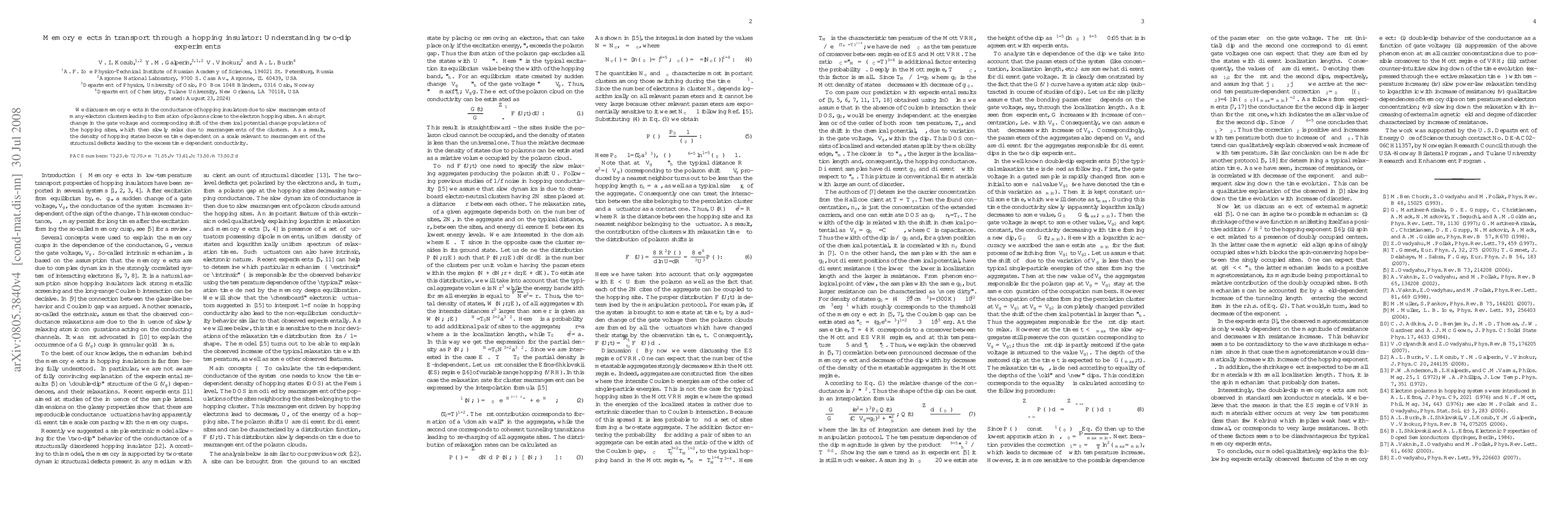 We discuss memory effects in the conductance of hopping insulators due to slow rearrangements of many-electron clusters leading to formation of polarons close to the electron hopping sites. An abrupt change in the gate voltage and corresponding shift of the chemical potential change populations of the hopping sites, which then slowly relax due to rearrangements of the clusters. As a result, the density of hopping states becomes time dependent on a scale relevant to rearrangement of the structural defects leading to the excess time dependent conductivity.