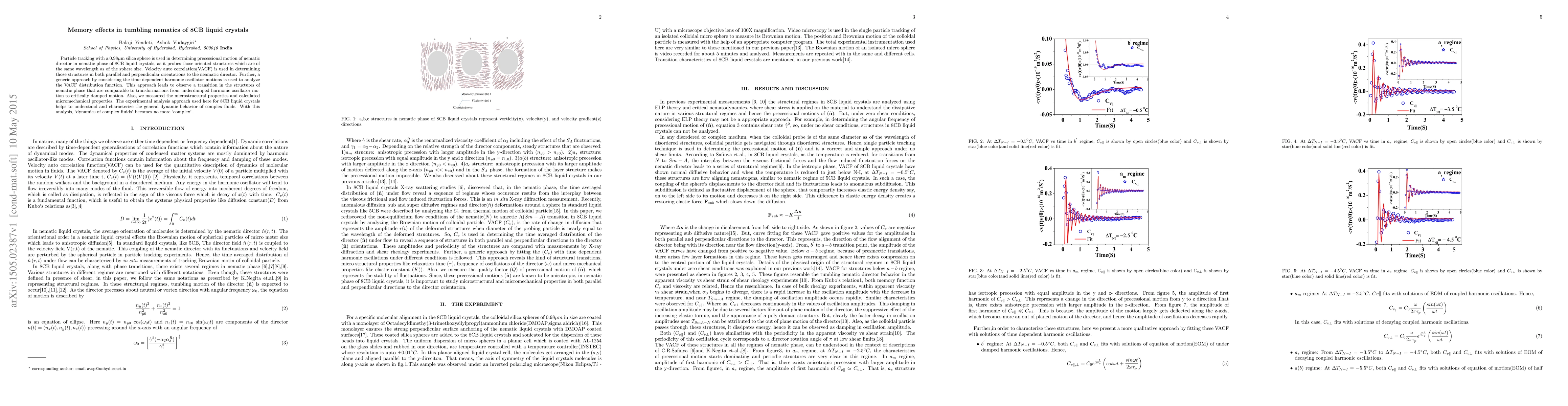 This study employs particle tracking and velocity auto correlation to investigate precessional motion and memory effects in the nematic phase of 8CB liquid crystals, revealing transitions in nematic structures akin to damped harmonic oscillator motions. The analysis elucidates the microstructural and micromechanical properties, simplifying the dynamics of complex fluids.