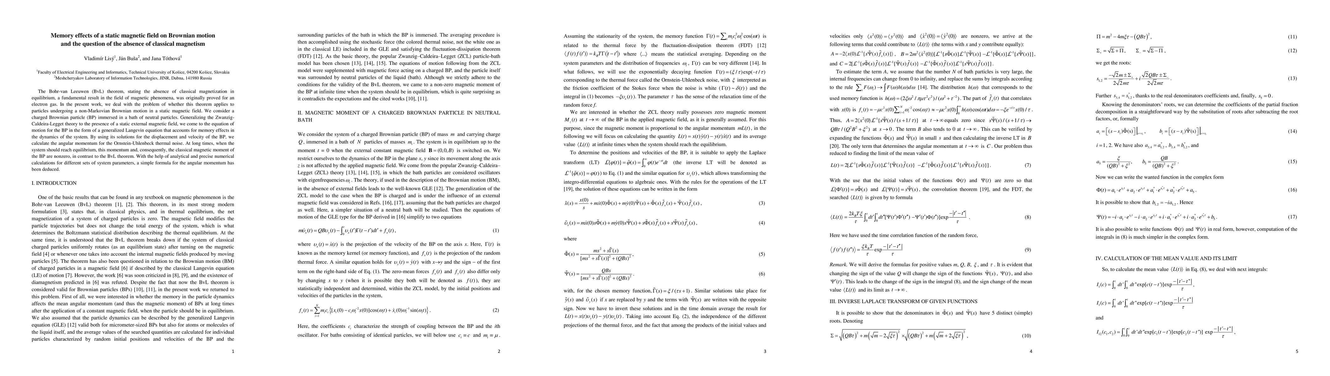 The Bohr-van Leeuwen (BvL) theorem, stating the absence of classical magnetization in equilibrium, a fundamental result in the field of magnetic phenomena, was originally proved for an electron gas. In the present work, we deal with the problem of whether this theorem applies to particles undergoing a non-Markovian Brownian motion in a static magnetic field. We consider a charged Brownian particle (BP) immersed in a bath of neutral particles. Generalizing the Zwanzig-Caldeira-Legget theory to the presence of a static external magnetic field, we come to the equation of motion for the BP in the form of a generalized Langevin equation that accounts for memory effects in the dynamics of the system. By using its solutions for the displacement and velocity of the BP, we calculate the angular momentum for the Ornstein-Uhlenbeck thermal noise. At long times, when the system should reach equilibrium, this momentum and, consequently, the classical magnetic moment of the BP are nonzero, in contrast to the BvL theorem. With the help of analytical and precise numerical calculations for different sets of system parameters, a simple formula for the angular momentum has been deduced.