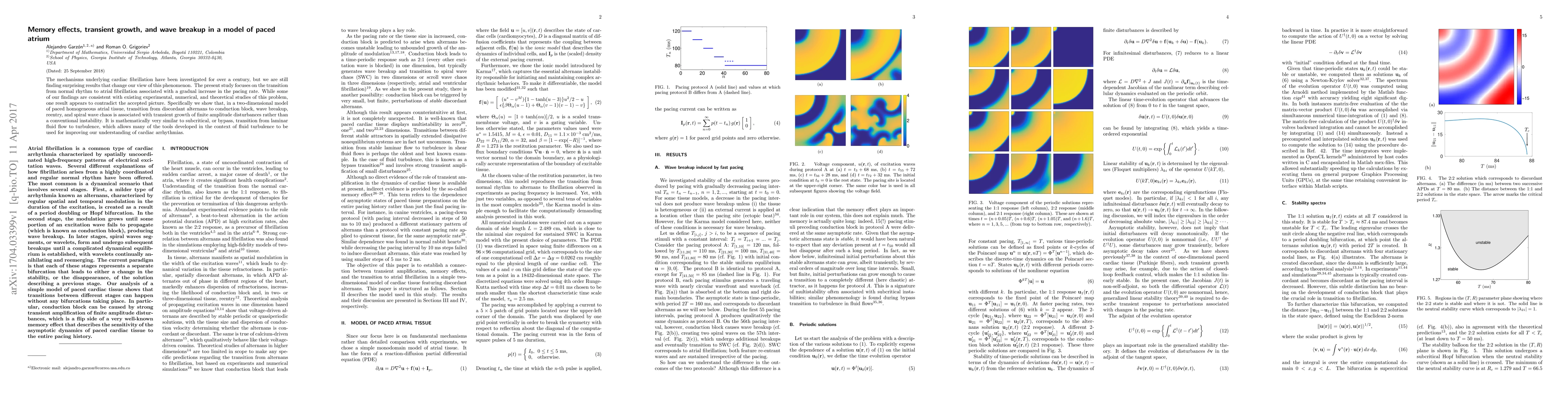 The mechanisms underlying cardiac fibrillation have been investigated for over a century, but we are still finding surprising results that change our view of this phenomenon. The present study focuses on the transition from normal rhythm to atrial fibrillation associated with a gradual increase in the pacing rate. While some of our findings are consistent with existing experimental, numerical, and theoretical studies of this problem, one result appears to contradict the accepted picture. Specifically we show that, in a two-dimensional model of paced homogeneous atrial tissue, transition from discordant alternans to conduction block, wave breakup, reentry, and spiral wave chaos is associated with transient growth of finite amplitude disturbances rather than a conventional instability. It is mathematically very similar to subcritical, or bypass, transition from laminar fluid flow to turbulence, which allows many of the tools developed in the context of fluid turbulence to be used for improving our understanding of cardiac arrhythmias.