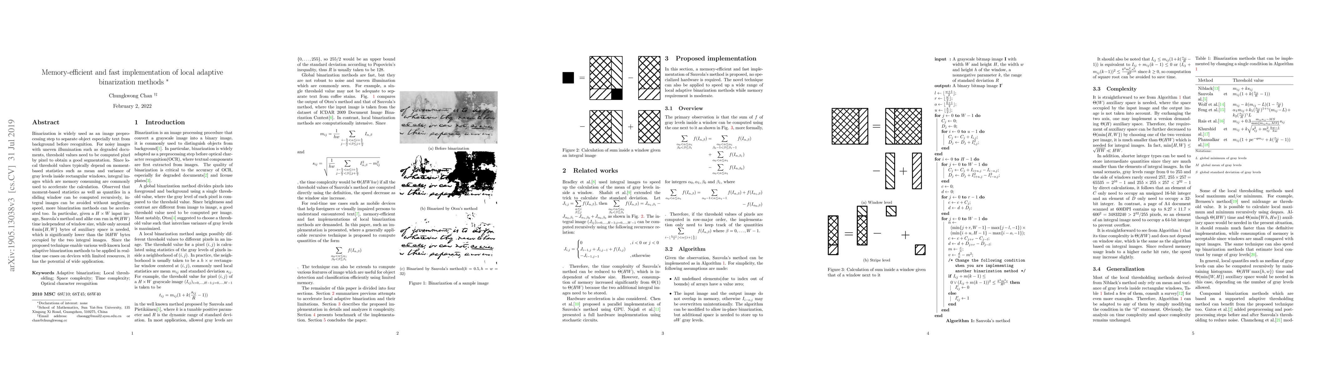 A new method for local adaptive binarization that uses recursive calculations to compute statistics without integral images, reducing memory usage from 16 bytes to 6 bytes per image, enabling real-time use on devices with limited resources.