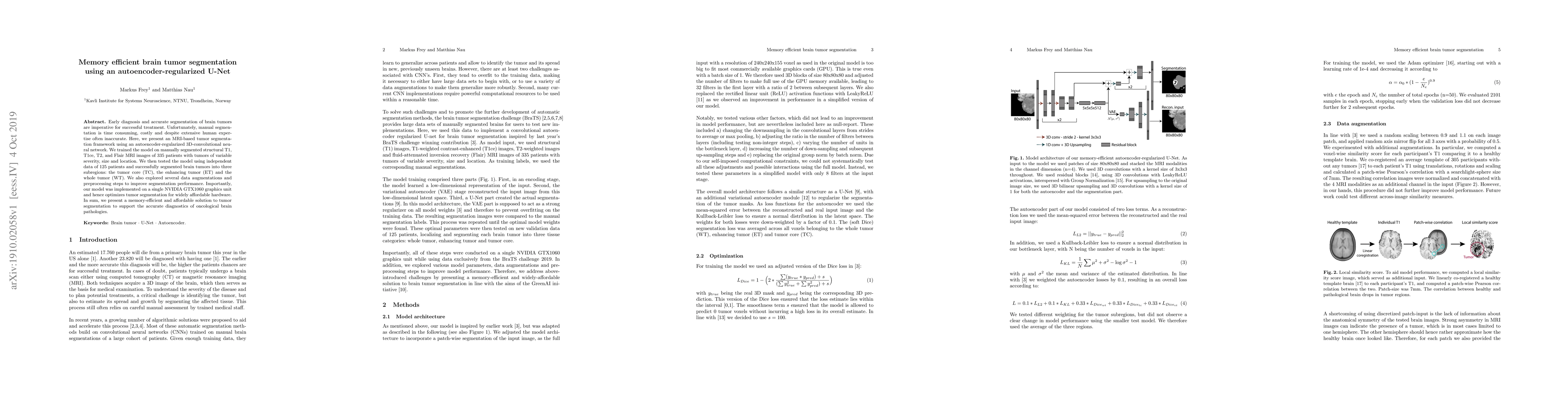 Early diagnosis and accurate segmentation of brain tumors are imperative for successful treatment. Unfortunately, manual segmentation is time consuming, costly and despite extensive human expertise often inaccurate. Here, we present an MRI-based tumor segmentation framework using an autoencoder-regularized 3D-convolutional neural network. We trained the model on manually segmented structural T1, T1ce, T2, and Flair MRI images of 335 patients with tumors of variable severity, size and location. We then tested the model using independent data of 125 patients and successfully segmented brain tumors into three subregions: the tumor core (TC), the enhancing tumor (ET) and the whole tumor (WT). We also explored several data augmentations and preprocessing steps to improve segmentation performance. Importantly, our model was implemented on a single NVIDIA GTX1060 graphics unit and hence optimizes tumor segmentation for widely affordable hardware. In sum, we present a memory-efficient and affordable solution to tumor segmentation to support the accurate diagnostics of oncological brain pathologies.