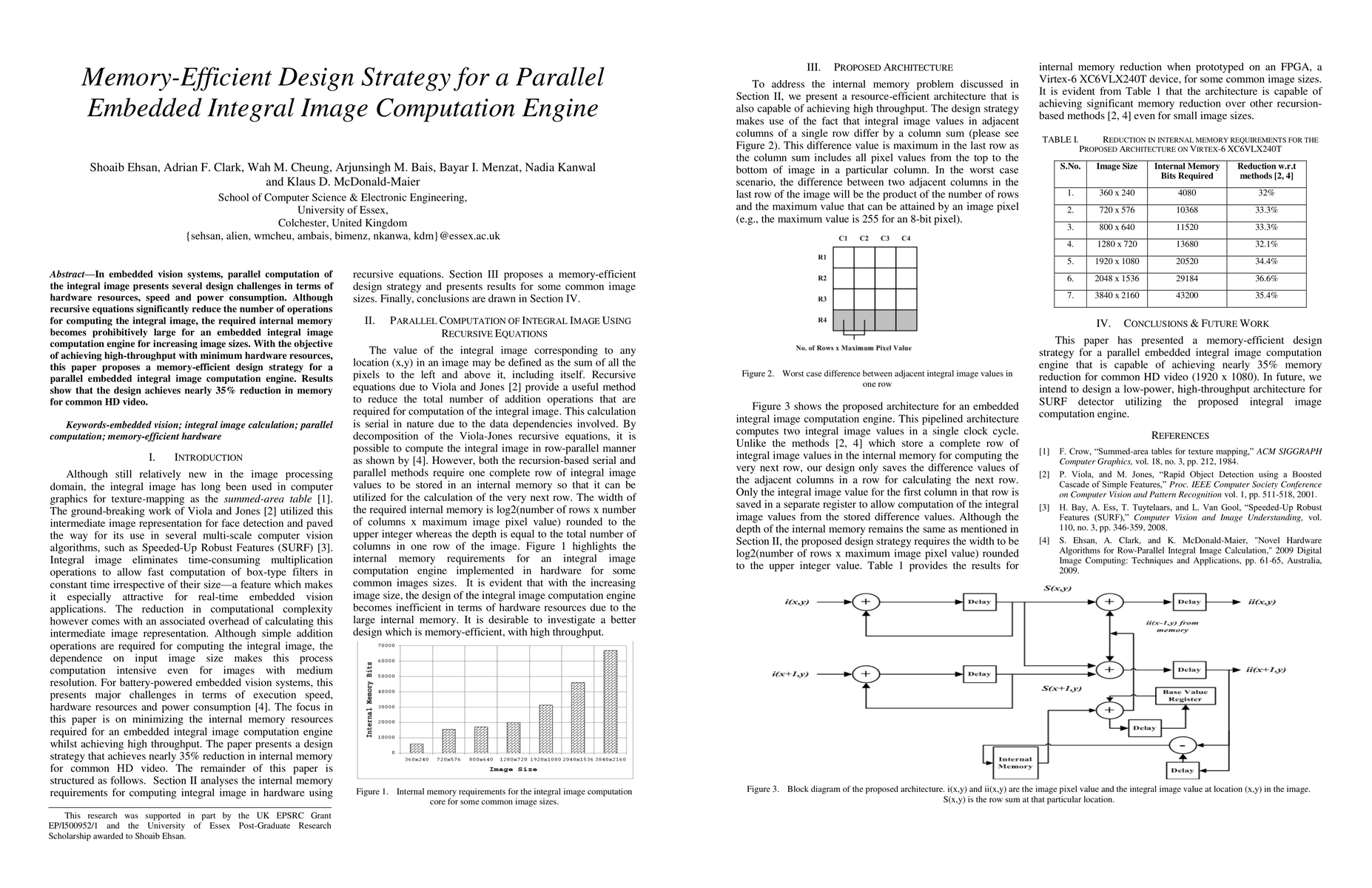 This paper proposes a memory-efficient design strategy for a parallel embedded integral image computation engine, addressing hardware resource constraints. The strategy achieves nearly 35% reduction in memory usage for high-definition video, balancing speed and power consumption.