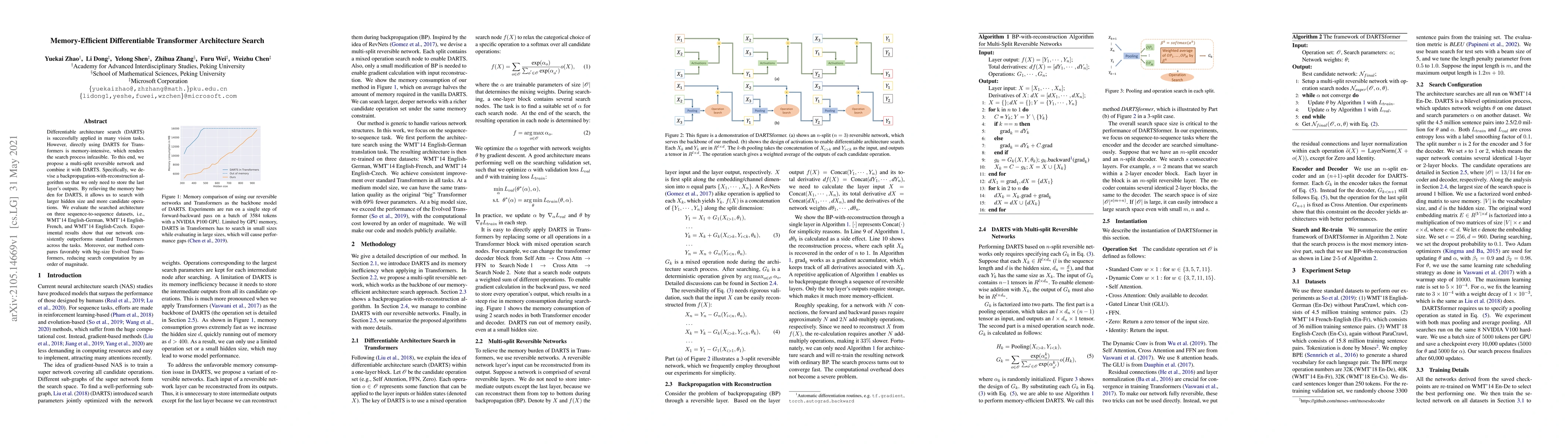This paper proposes a memory-efficient differentiable transformer architecture search method using a multi-split reversible network and a backpropagation-with-reconstruction algorithm. The approach enables searching with larger hidden sizes and more operations, outperforming standard Transformers on three sequence-to-sequence tasks while reducing search computation significantly.