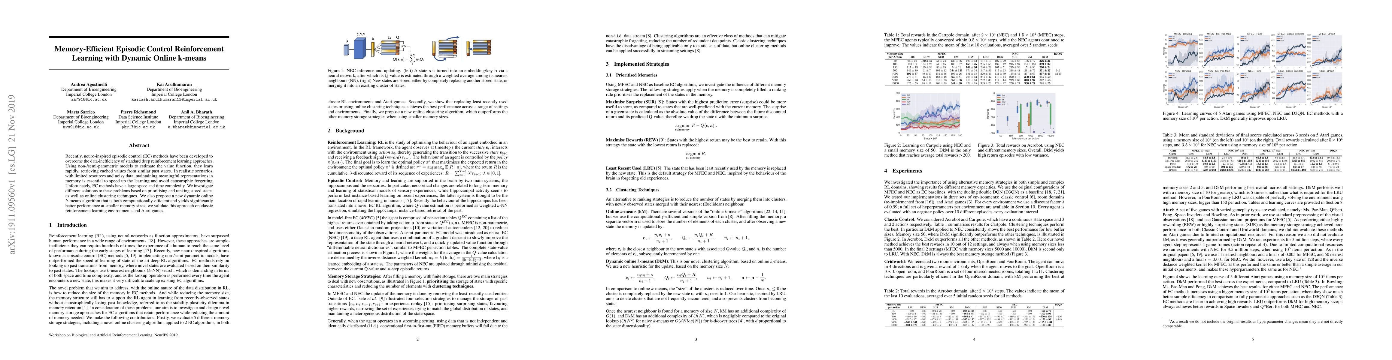 This paper proposes memory-efficient episodic control reinforcement learning using dynamic online k-means to reduce space and time complexity, prioritizing and ranking stored states, and improving performance with smaller memory sizes. The new algorithm is validated on classic environments and Atari games.