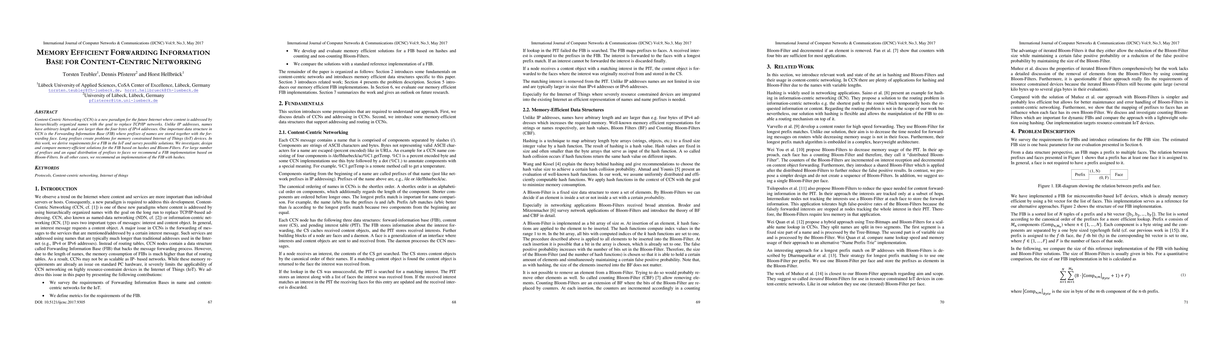 The paper presents memory-efficient FIB implementations using hashing and Bloom-Filters tailored for memory-constrained IoT devices in CCN.